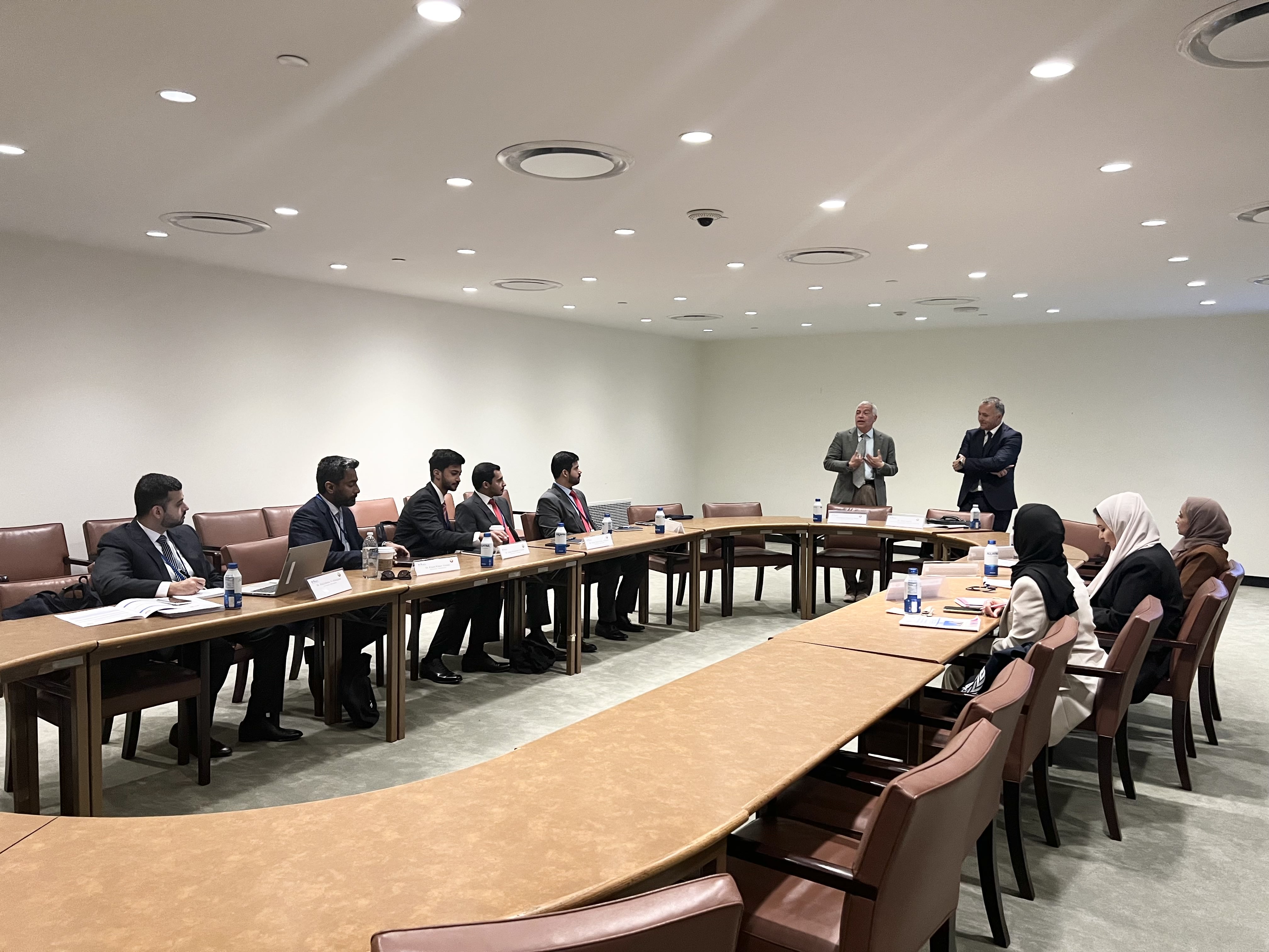 After attending the Briefing for New Delegates to the General Assembly, the following day of the training kicked off at 10:00 am (EST). Mr. Marco Suazo, Head of the UNITAR New York Office, welcomed the Qatari delegates and Dr. Angel Angelov, Former Deputy Representative of Bulgaria to the United Nations and Consul General. Dr. Angelov spoke about the United Nations System as a whole, discussing the United Nations Principal Organs. He talked about all committees (first to sixth) explaining each committee’s mission and work responsibilities. Moving forward, he discussed the two types of players, the States and Groups providing examples during the discussion. Dr. Angelov also discussed the permanent and non-permanent members as well as the Arab swing seat. The end of the session was followed by a Q&A.