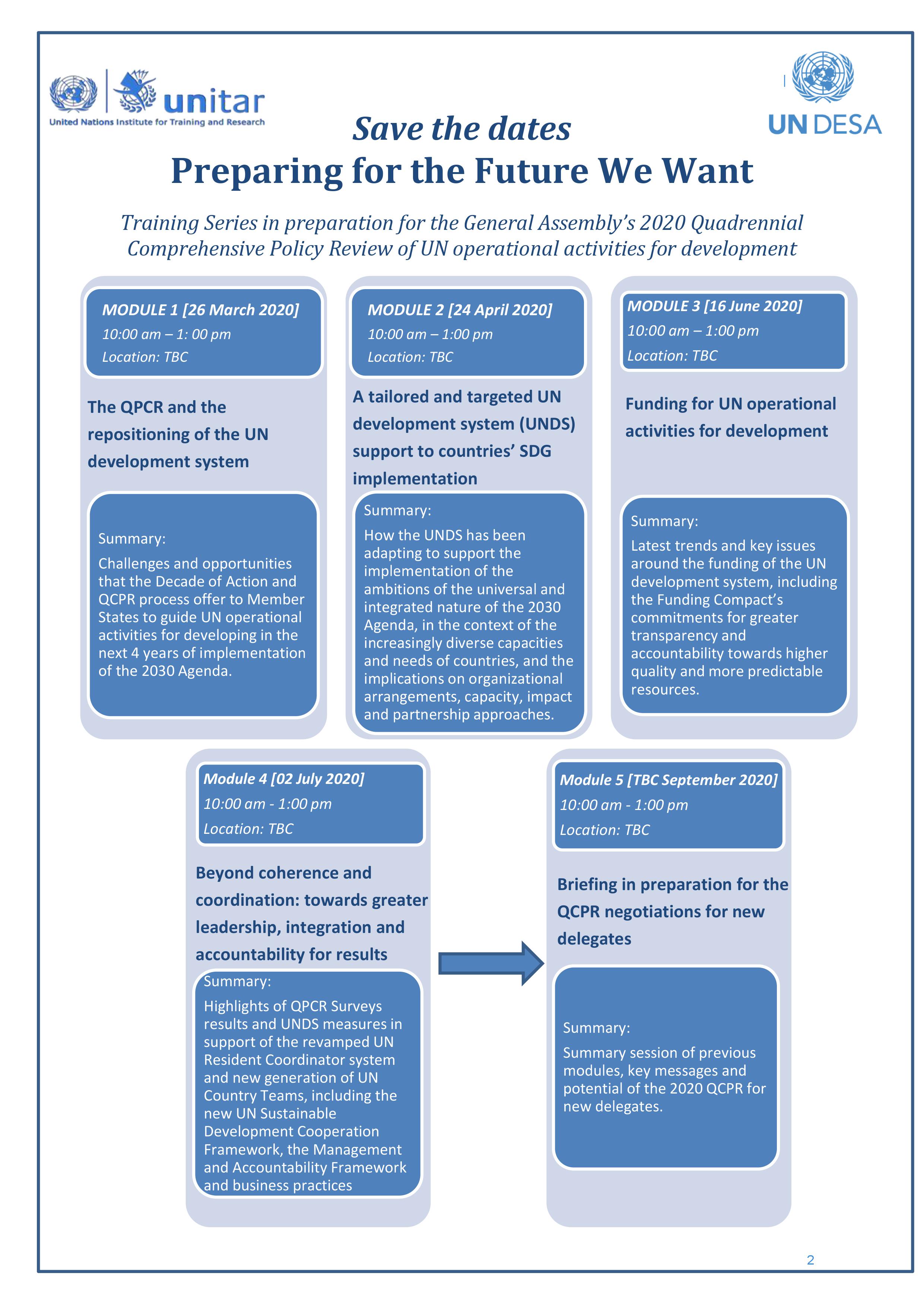 In the afternoon session, Mr. Marco A. Suazo,, who served as moderator and chair during the whole day, gave warm welcoming remarks as delegates returned to the training, and introduced the sessions speakers, Ms. Zina Mounla, Chief of DESA Operational Activities Policy Branch and Mr Matthew Hammill, also from DESA’s Operational Activities Policy Branch who remarked the importance of 2020 in the Quadrennial Comprehensive Policy Review (QCPR) as a process and key vehicle by which the General Assembly and ECOSOC can provide policy guidance and assess activities for development, adopted through General Assembly resolution 71/243. Ms. Mounla thanked UNITAR that during 2020, will be developing a series of training modules to support the delegates with the QCPR process.