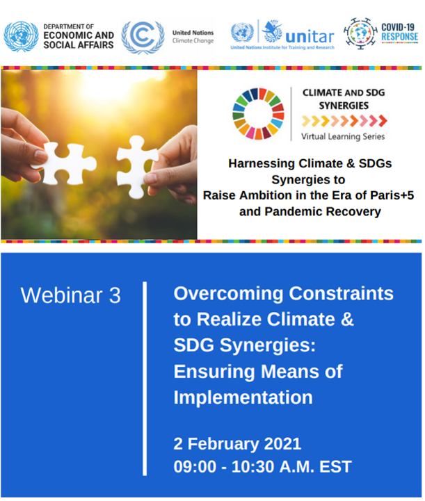 3 February 2021, New York, USA (Virtual) – The United Nations Institute for Training and Research (UNITAR) New York office announced the launching of “Harnessing Climate & SDG Synergies to Raise Ambition in the Era of Paris+5 and Pandemic Recovery” online course series in collaboration with the United Nations Department of Economic and Social Affairs (UNDESA) and United Nations framework Convention on Climate Change (UNFCC). Five years after the adoption of the Paris Agreement and the 2030 Agenda for sustainable development, Covid-19 pandemic has drastically, yet disproportionately affected lives around the world. The virus disruption resulted in deeper inequality and more challenges in advancing both the climate agenda and the realization of SDGs. In response to the current situation, UNDESA, UNFCC and UNITAR organized three webinars since last December on three topics respectively: “making the case for integrated climate SDG Action”, “how to maximize climate & SDG synergies – identifying opportunities and navigating trade-offs”, and “overcoming constraints to implement climate & SDG synergies – capacity, financing, and monitoring.”