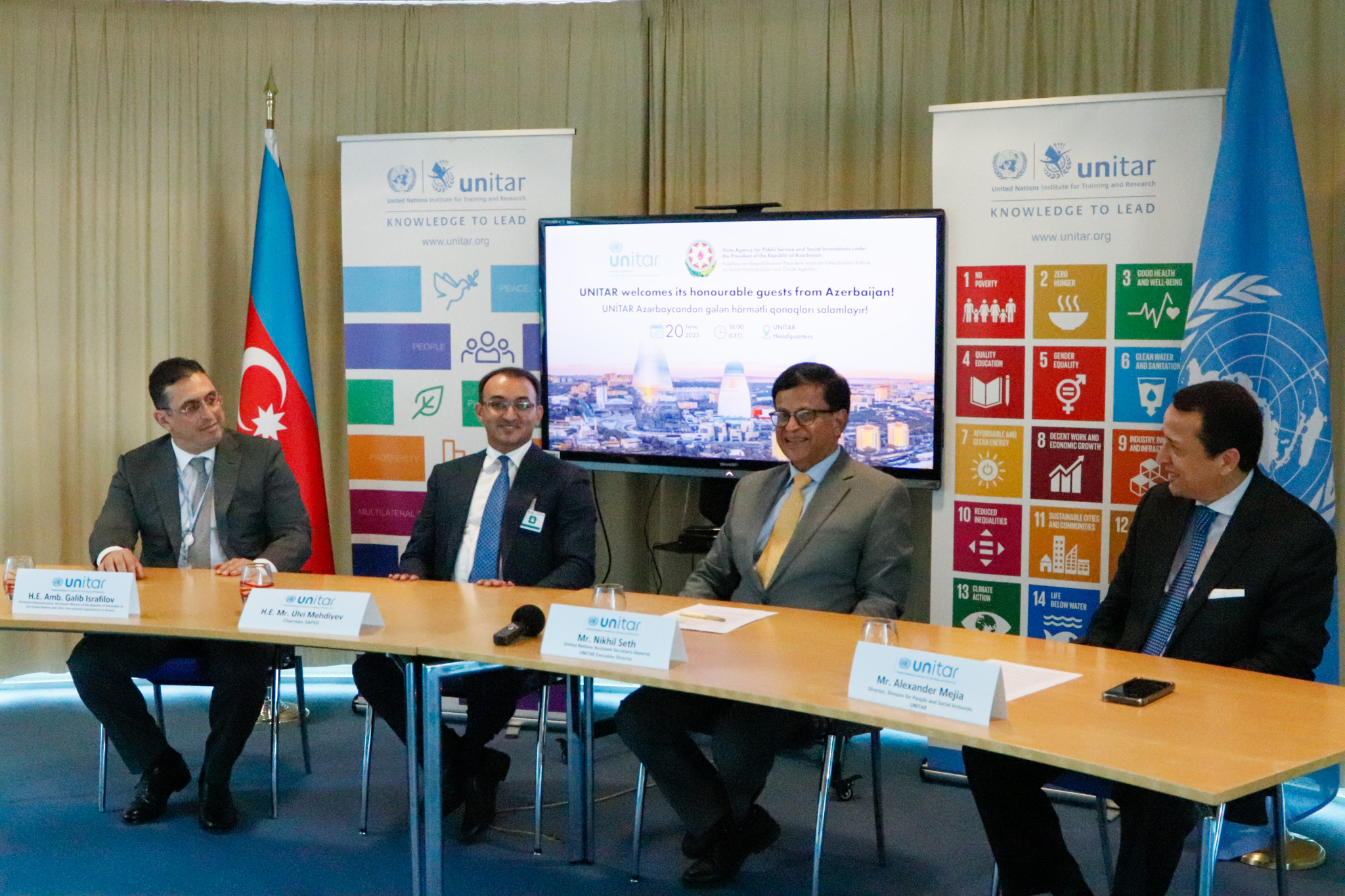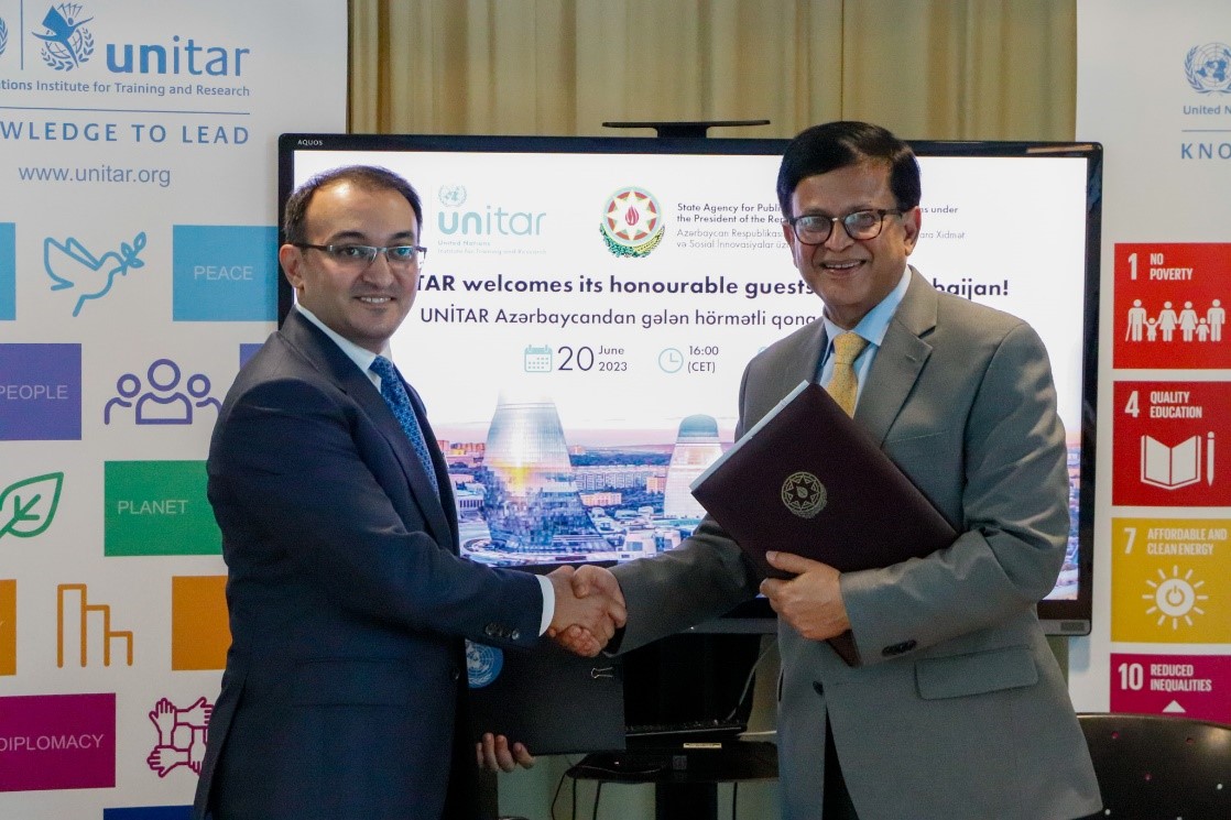 Under this agreement, UNITAR will collaborate closely with the State Agency to develop and implement training programmmes, capacity-building initiatives, and research projects tailored to the specific needs and priorities of SAPSSI and UNITAR’s international beneficiaries, to enhance the skills and knowledge of public servants and public service users, foster innovation in public service delivery, and promote best practices that align with the global sustainable development agenda, all within the framework of, in the words of SAPSSI Chairman H.E. Ulvi Mehdiyev, “promoting transparency, efficiency, and accountability in public service delivery”.