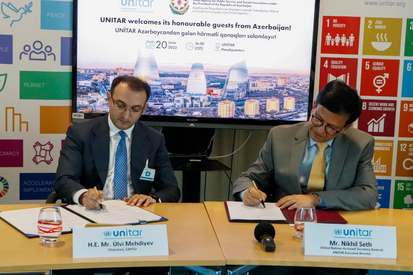 20 June 2023. Geneva, Switzerland— “The world is changing, and the expectations of our citizens are changing even faster. Governments these days have to make a topmost priority of meeting these expectations.” These are the words with which United Nations Assistant Secretary-General and UNITAR Executive Director, Mr Nikhil Seth, inaugurated the long-awaited signing ceremony between UNITAR and SAPSSI, the state agency which spearheaded the digitalization of all government services through its “ASAN Services” platform—a one-stop-shop for the efficient and citizen-centric delivery of public services.