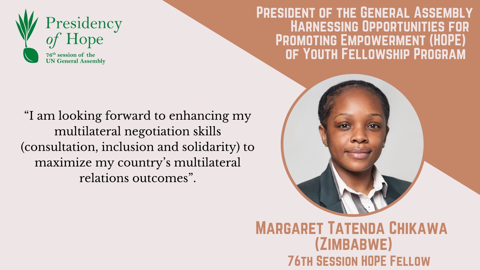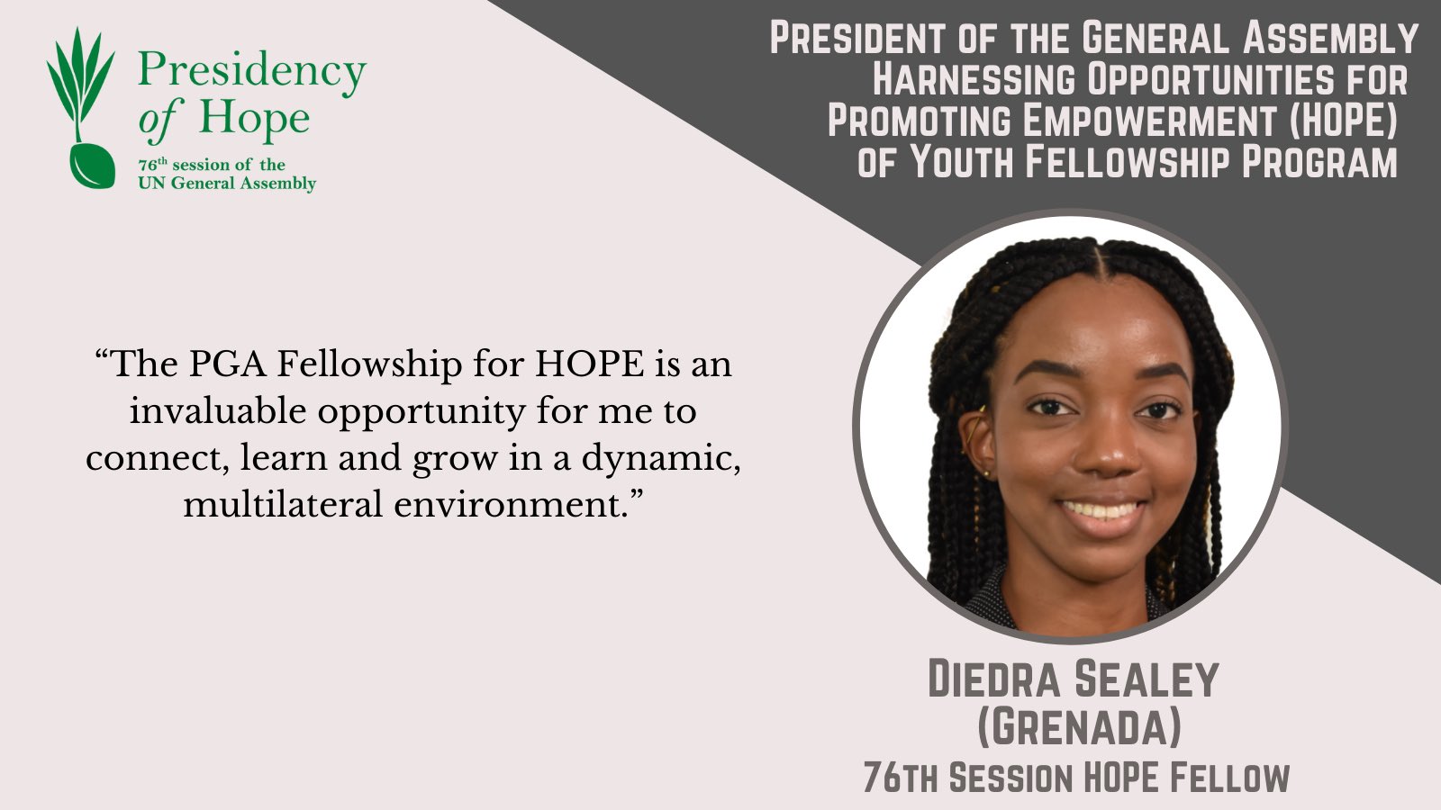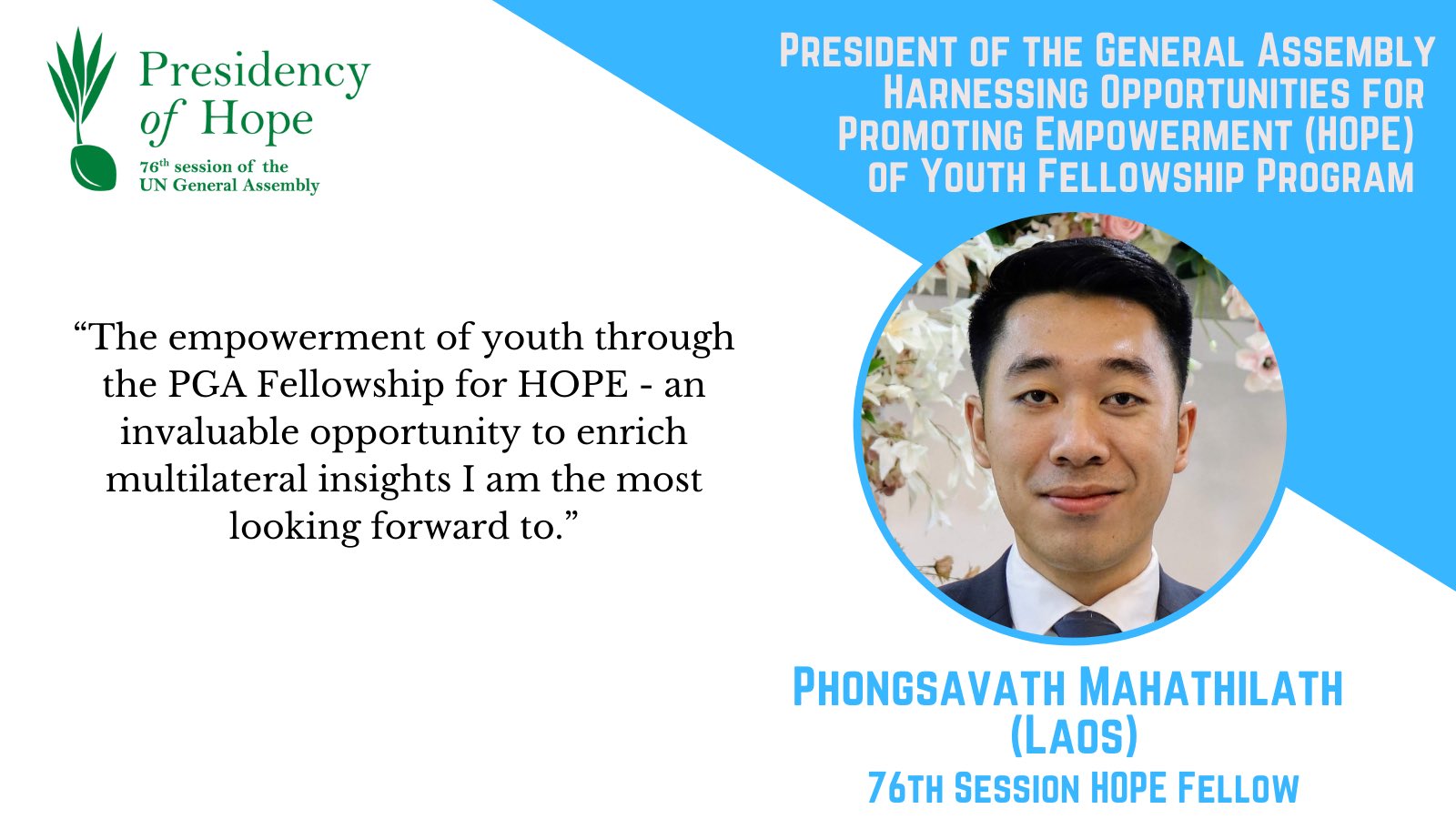The PGA Fellowship for HOPE, which lasts through the tenure of the 76th GA, has brought 8 young diplomats/civil servants working for their countries’ foreign ministries to UNHQ in New York for an intensive, multifaceted programme. The 2022 HOPE Fellows will rotate through OPGA’s six substantive working teams (Peace & Security; Human Rights; Humanitarian; Sustainable Development; Reform, Legal & Budget; and Communications), work closely with their Permanent Missions on various responsibilities, and receive weekly UNITAR training workshops on UN processes and relevant topics.