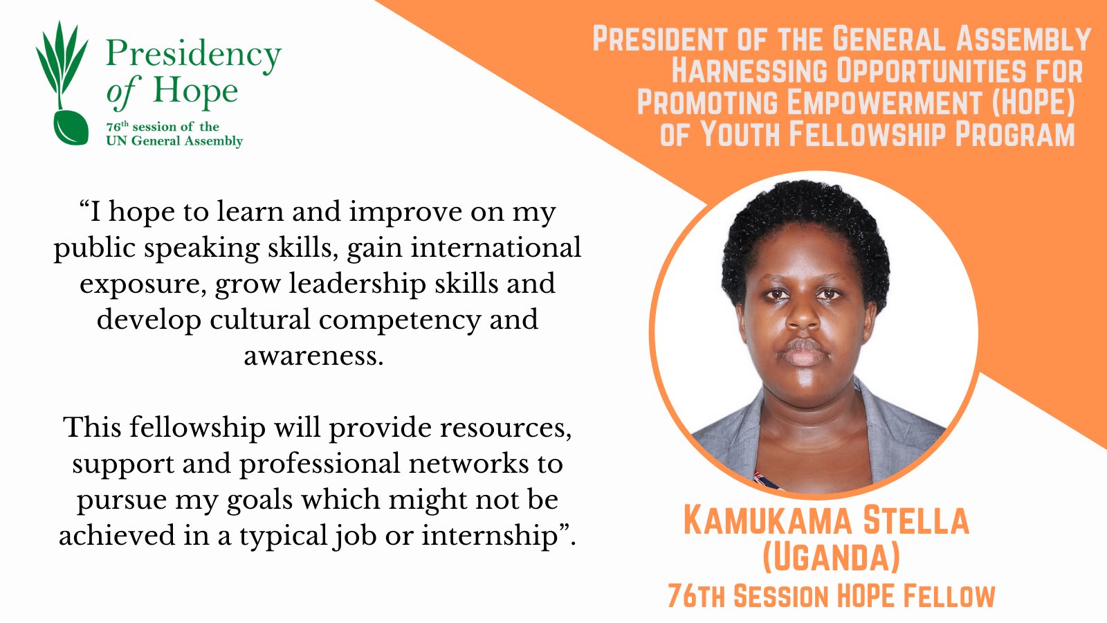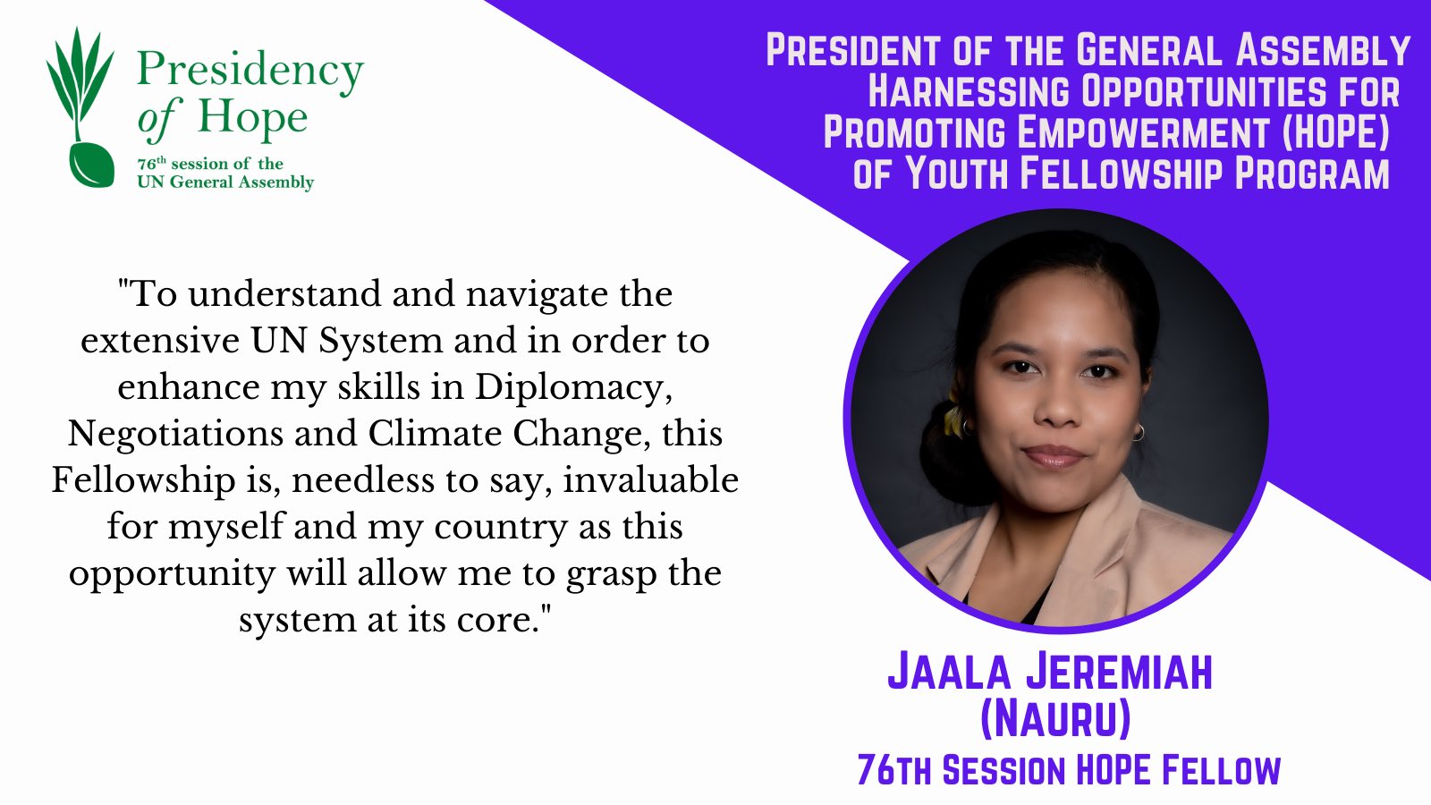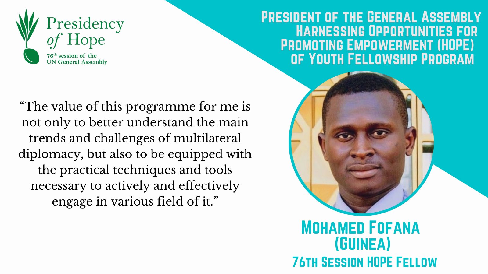 The PGA Fellowship for HOPE, which lasts through the tenure of the 76th GA, has brought 8 young diplomats/civil servants working for their countries’ foreign ministries to UNHQ in New York for an intensive, multifaceted programme. The 2022 HOPE Fellows will rotate through OPGA’s six substantive working teams (Peace & Security; Human Rights; Humanitarian; Sustainable Development; Reform, Legal & Budget; and Communications), work closely with their Permanent Missions on various responsibilities, and receive weekly UNITAR training workshops on UN processes and relevant topics.