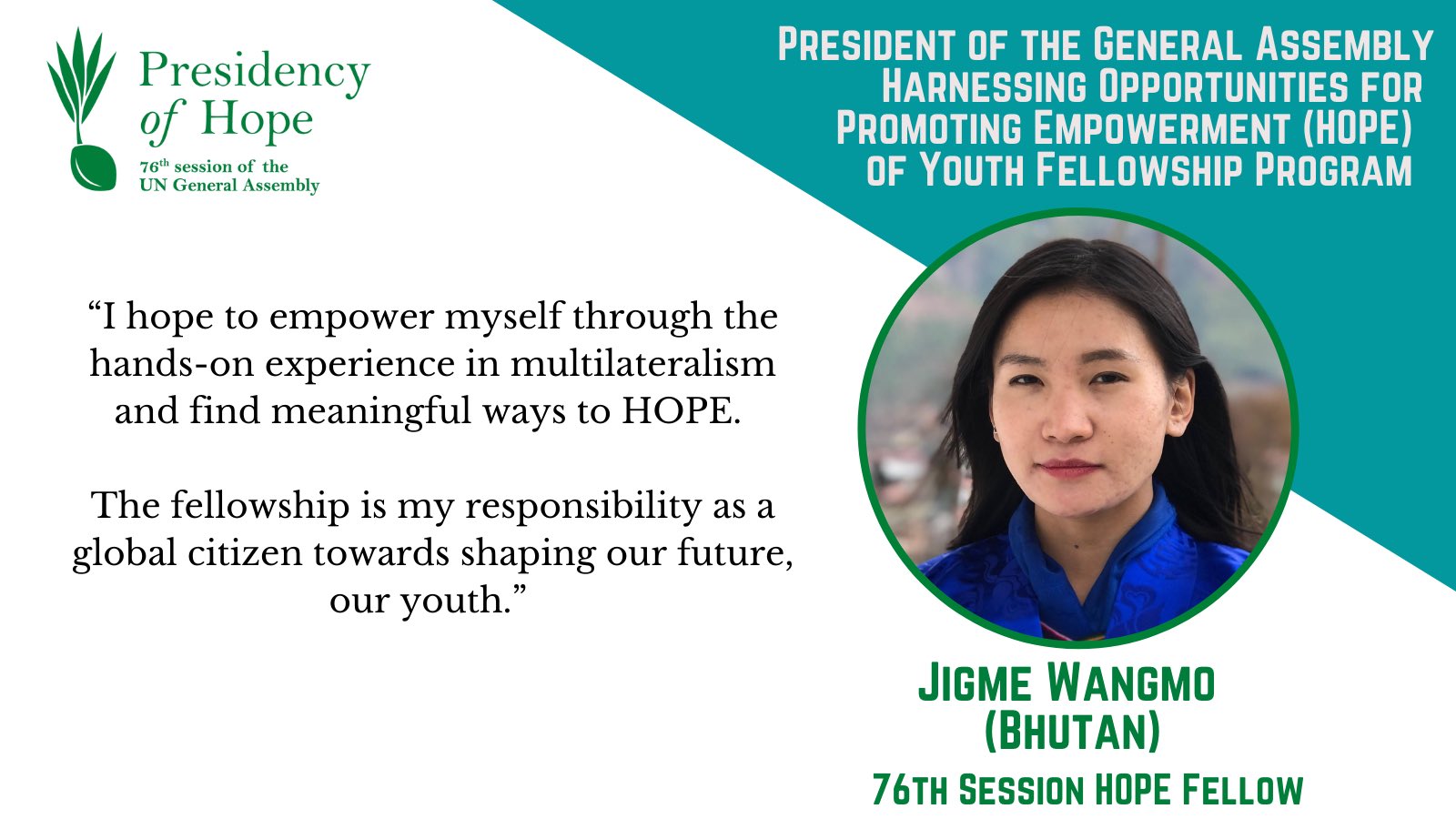 10 January 2022, New York, USA – The United Nations Institute for Training and Research (UNITAR), in partnership with the Office of the President of the General Assembly (OPGA), successfully launched its flagship initiative, the 2022 President of the General Assembly Fellowship for HOPE (Harnessing Opportunities for Promoting Empowerment of Youth) on 10 January 2022. As envisioned by H.E. Mr. Abdulla Shahid, President of the 76th General Assembly, and his Presidency of Hope, this Fellowship programme aims to promote youth engagement in multilateralism and support the next generation of diplomats, particularly from underrepresented countries (LDCs, LLDCs, SIDS) at the United Nations, while also ensuring geographical representation and gender balance.