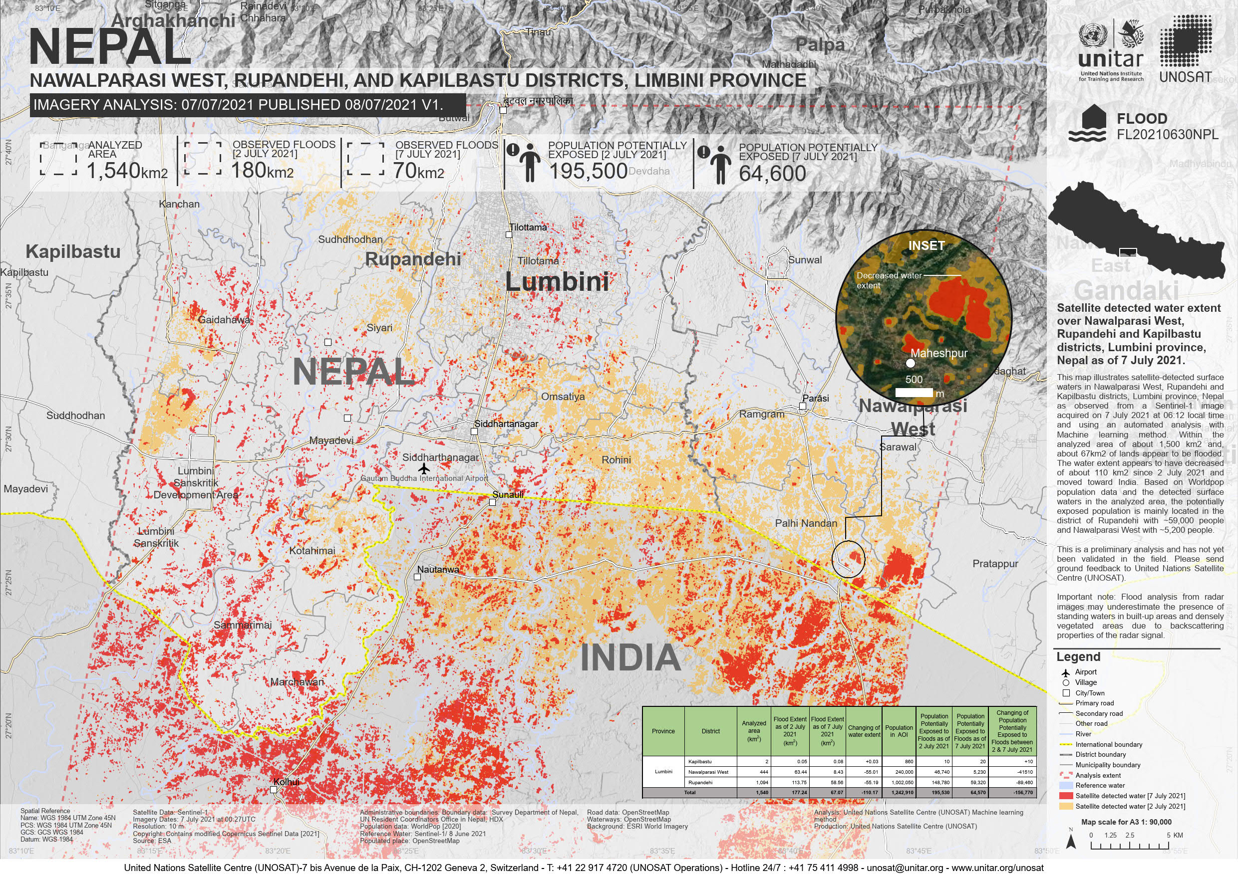 Nepal, being very prone to monsoon-related hazards, has a humanitarian Cluster System in place, under the leadership of the government, and supported by humanitarian organizations in-country to coordinate preparedness and response activities. Each year, an Emergency Response Plan is prepared to guide contingency planning, preparedness, and recovery efforts. When the monsoon started this year, Ragindra Man Rajbhandari, Humanitarian Information Management Unit Manager at UNRCO, contacted UNOSAT to complement the existing tools and processes in place. “We needed the eyes from above to monitor the situation, so we can inform the response decision in time and make the humanitarian response more effective”, explains Mr Rajbhandari. User needs focused on the extent of the water and population exposure. With satellite imagery-derived analysis, the team on the ground was able to differentiate between waterlogging and flooding.