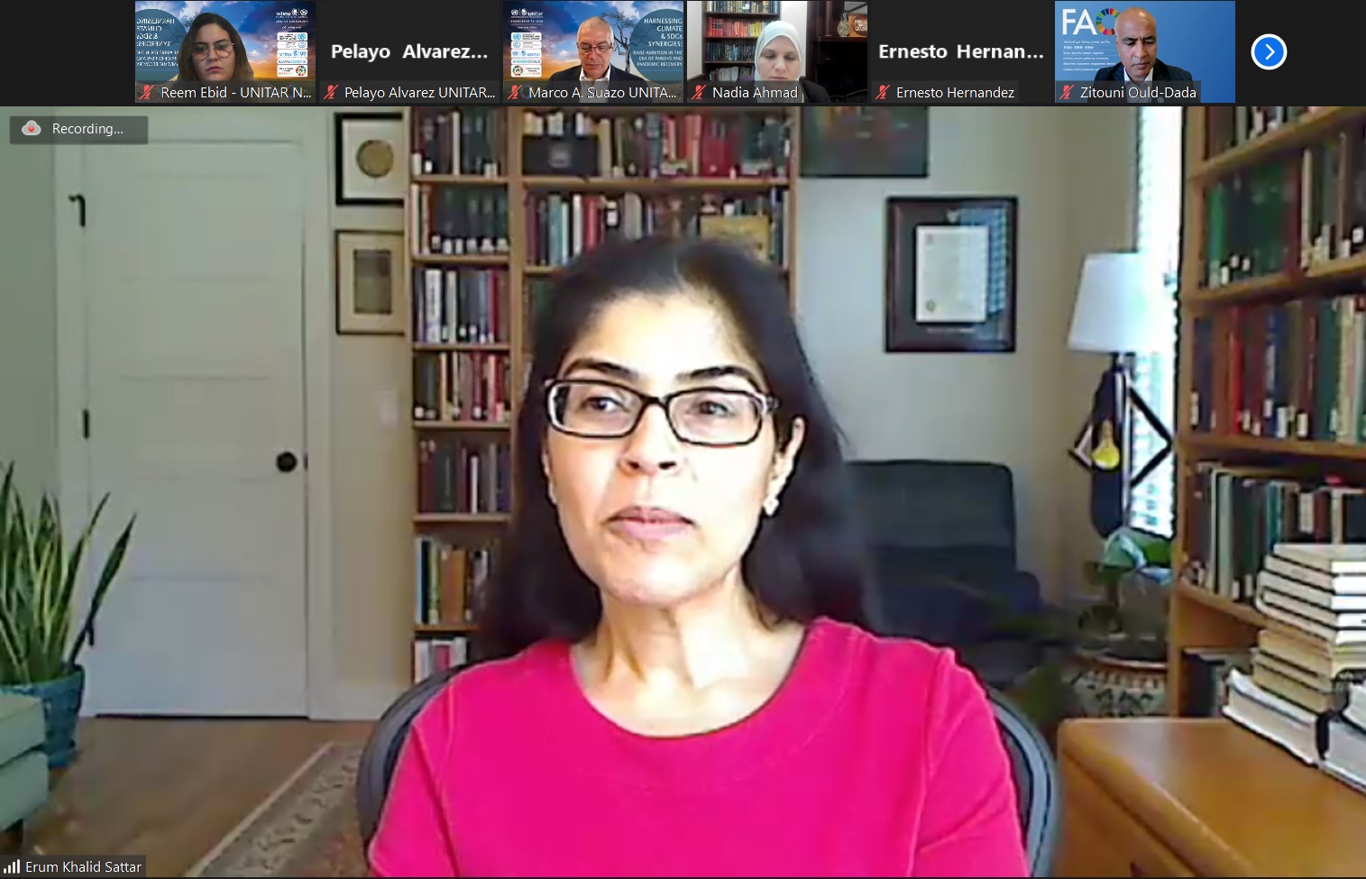Mr. Marco A. Suazo, head of UNITAR office in New York, welcomed the panelist and participants. He talked about the longstanding partnership with Yale in creating events that support the climate change. Mr. Suazo mentioned how UNITAR aligns its values with Conference of Parties (COP) focusing on eliminating factors that affect our climate, taking into account that the climate is already changing. He mentioned that one of the ways for UNITAR acknowledged the issues of climate change and its interconnections with the Agenda 2030 was by creating an E-learning course called “Harnessing Climate & SDGs Synergies”. Mr. Suazo the passed the floor to Ms. Nadia Ahmad, Visiting Associate Professor, Yale Law School; Associate Professor of Law, Barry University.
