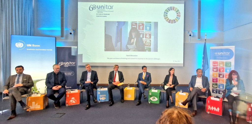 3 May 2023 - Bonn, Germany - UNITAR, the United Nations Institute for Training and Research, celebrates its 60th anniversary in 2023. Since 2020, UNITAR has also had an office on the UN Campus in Bonn. The Bonn office marked the anniversary on Wednesday, May 3, 2023, with a high-level panel discussion on the past and future of education and research in response to current global challenges. Afterwards, the city and UNITAR hosted a reception on the UN Campus.