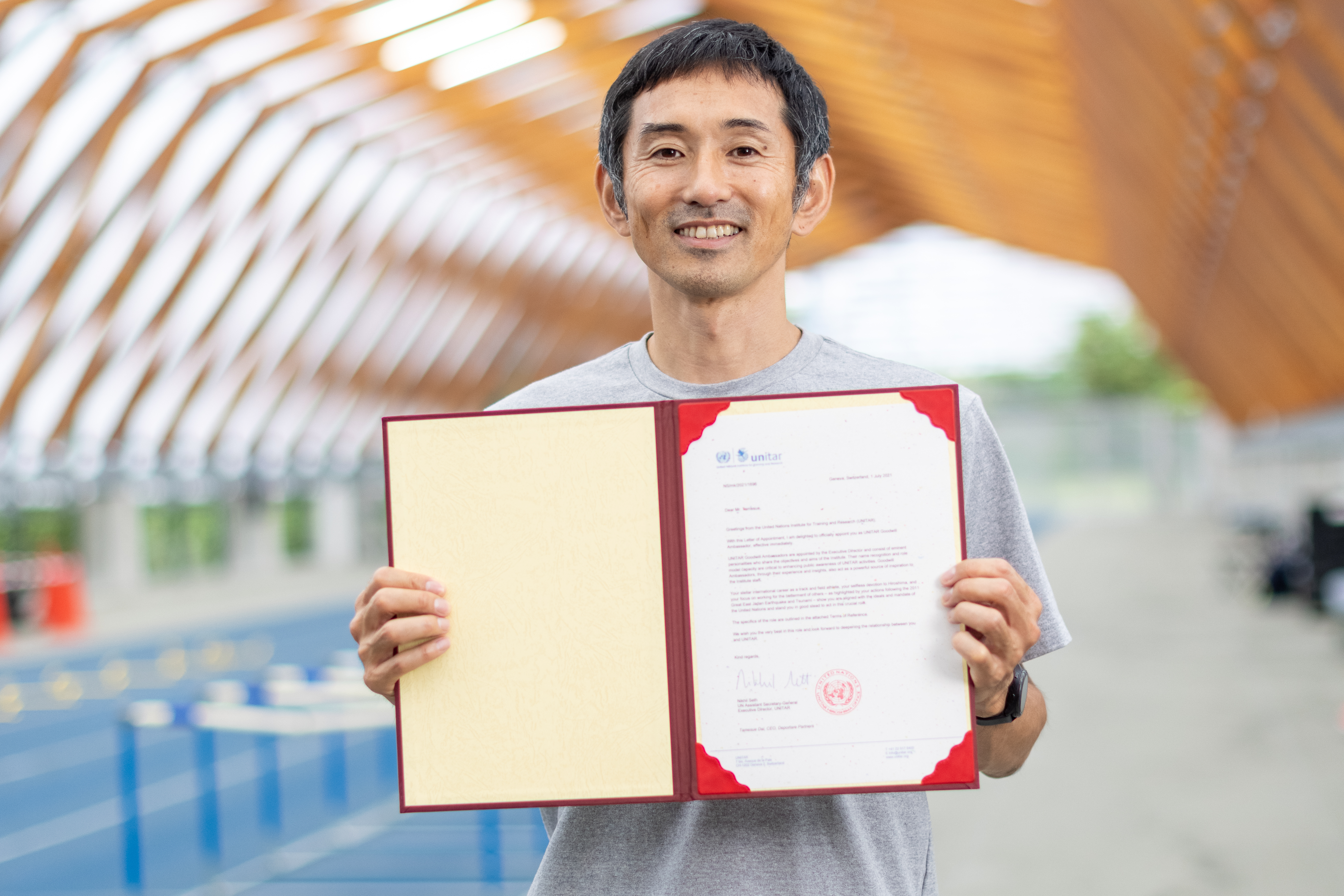 16 July 2021, Hiroshima, Japan – Dai Tamesue, two-time World Championships bronze medallist in the 400m hurdles, was appointed UNITAR Goodwill Ambassador in July 2021. “I am committed to training Asian athletes and fostering friendship among them, so I resonate with UNITAR’s activities. I look forward to promoting its missions,” said Mr. Tamesue at the online press conference held on 14 July 2021.