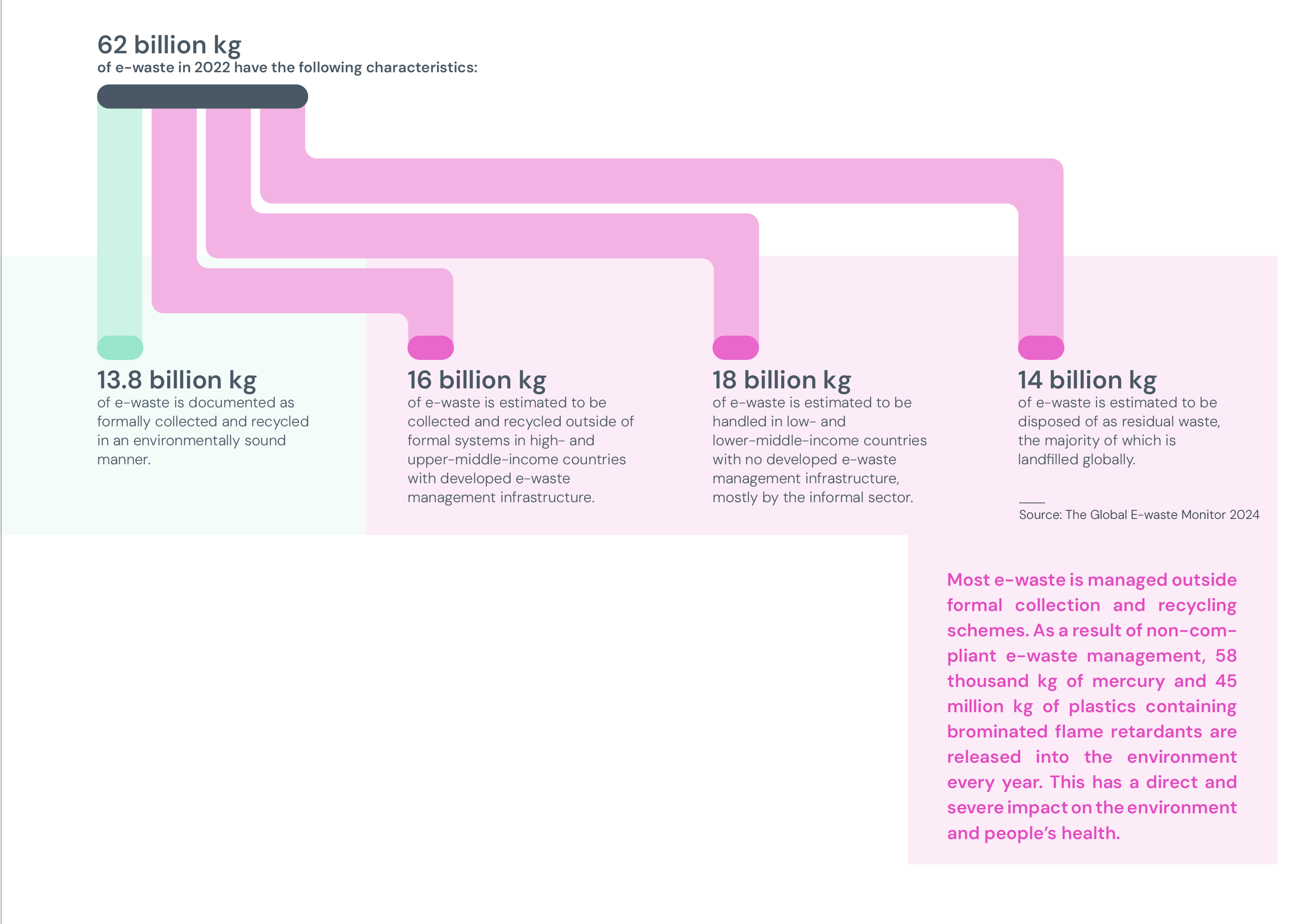 Many in today’s society use multiple computers and phones, an ever-growing number of new appliances, monitors and sensors, e-bikes, e-scooters, clothes, toys, and furniture with embedded electronics, electric tools, and energy-saving equipment such as LEDs, photovoltaics, and heat pumps. Urban and remote areas are increasingly connected to the Internet, and a growing number of data centers cater to the needs of the digital transformation. In the face of all this, concrete steps are urgently needed to address and reduce e-waste. Improved ewaste management could result in a global net positive of US $38 billion, representing a significant economic opportunity while addressing climate change and health impacts. Ruediger Kuehr , Senior Manager, Sustainable Cycles (SCYCLE), Programme, UNITAR / Adjunct Professor, University of Limerick (Ireland)