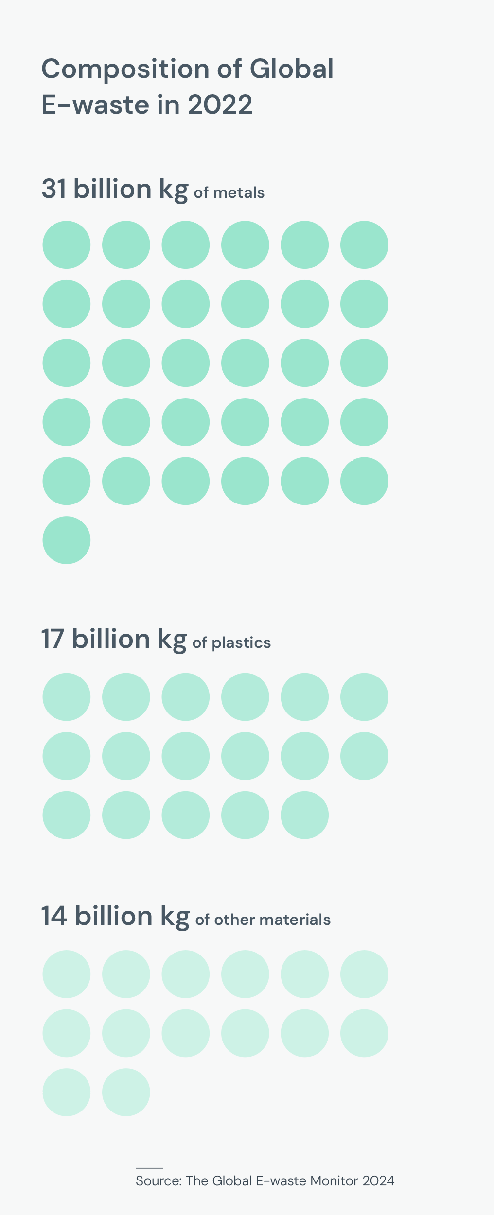 - 31 million tonnes: estimated weight of metals embedded in e-waste in 2022, along with 17 million tonnes of plastics and 14 million tonnes of other materials (minerals, glass, composite materials, etc.)