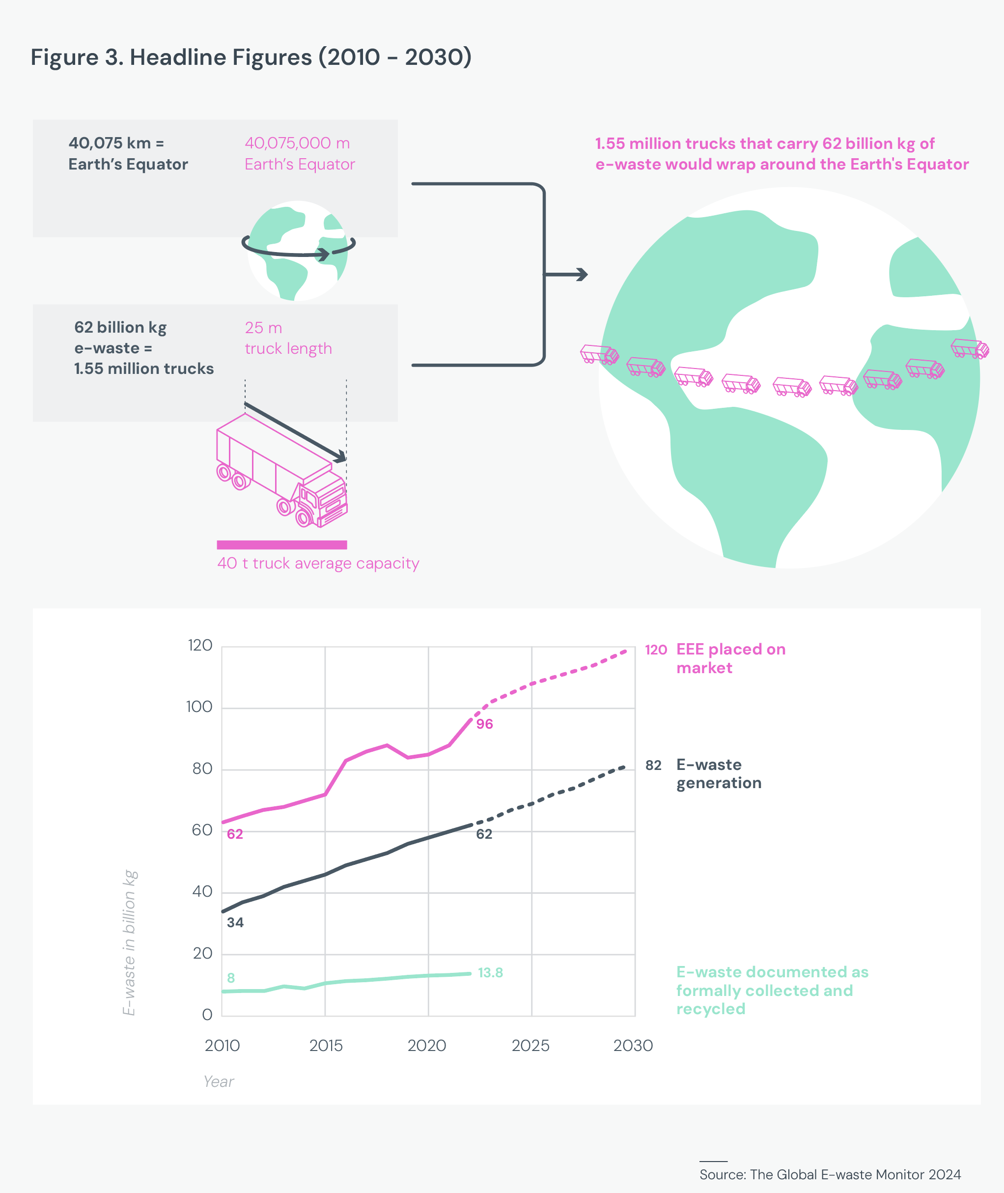 20 March 2024, Geneva / Bonn - The world’s generation of electronic waste is rising five times faster than documented e-waste recycling, the UN’s fourth Global E-waste Monitor (GEM) reveals today. The 62 million tonnes of e-waste generated in 2022 would fill 1.55 million 40-tonne trucks, roughly enough trucks to form a bumper-tobumper line encircling the equator, according to the report from ITU and UNITAR.