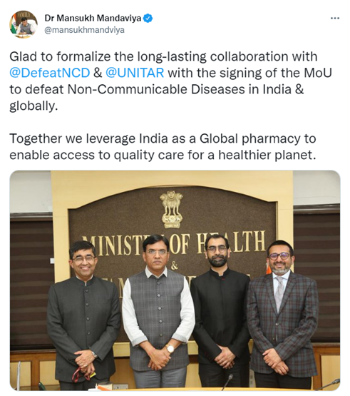 13 September 2022, Geneva, Switzerland – The Ministry of Health and Family Welfare signed a memorandum of understanding (MoU) with The Defeat-NCD Partnership at the United Nations Institute for Training and Research (UNITAR). The partnership is aimed at advancing Sustainable Development Goal 3.4 i.e., the reduction by one-third of premature mortality from NCDs through prevention and treatment and supporting efforts to enable and assist all low-resource countries to scale-up action on NCDs through the four pillars of work of the Defeat-NCD Partnership.