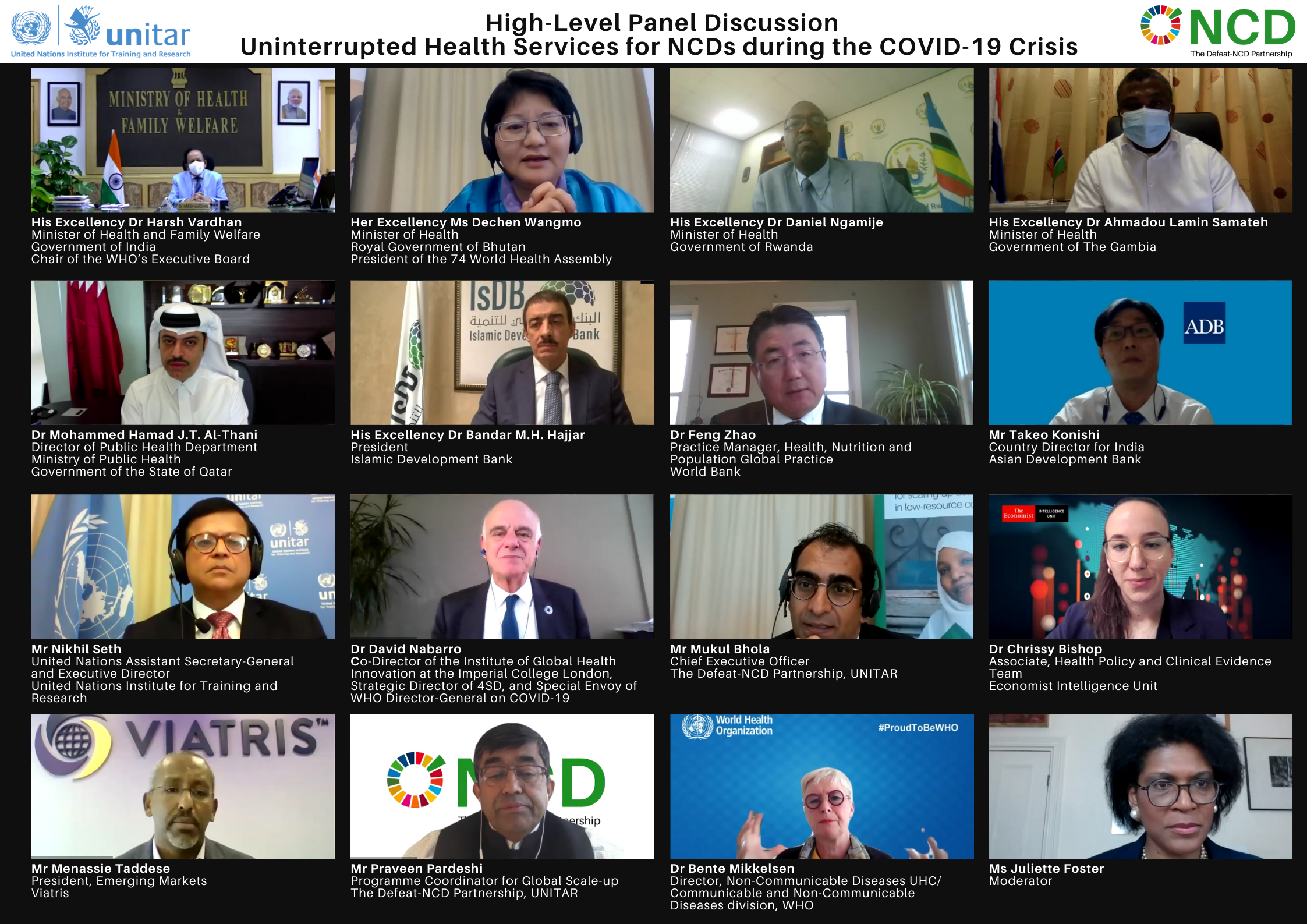 25 May 2021, Geneva, Switzerland – The President of the 74th World Health Assembly and Minister of Health, Royal Government of Bhutan, Ms Dechen Wangmo visited the Defeat-NCD Partnership’s office at the United Nations Institute for Training and Research (UNITAR) in Geneva today to set the tone at a high-level panel discussion aimed at tackling the twin challenges of COVID-19 and non-communicable diseases (NCDs). “I understand that time has passed for mere statements and rhetoric in addressing the Sustainable Development Goals (SDGs) of universal access to health”, she said. “It is time to act now”.