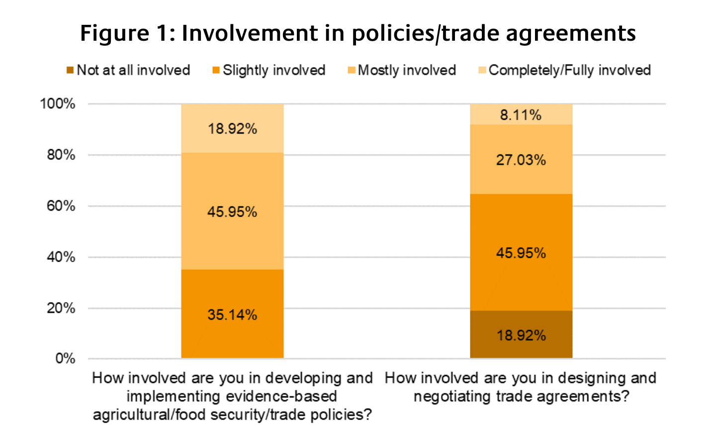 Most of the survey respondents (81 per cent) are government officials involved in the design and implementation of agricultural, food security or trade policies at different levels or in the design and negotiation of trade agreements. Likewise, all the respondents working in other sectors (NGOs, private sector, and international organizations) are involved either in designing and implementing trade policies or trade agreements (See Figure 1). The high level of alignment between the course’s objectives and the participants’ involvement in trade or food systems issues in supported the application of knowledge and skills to their workplaces.