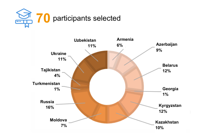 High demand for the course, which was delivered in Russian and ran for 4 weeks, was witnessed following 343 applications. The main target audience, professionals working in governmental organizations, submitted a large percentage of applications (32.9 per cent of total applications). Other applications were also received from professionals working in academia, non-governmental organizations, private sector and regional organizations among others. 70 participants were selected with 55 per cent of those being women.