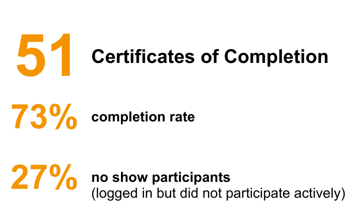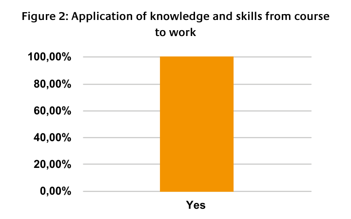 The relevance of the course was rated highly satisfactory following 100 per cent of the course evaluation survey respondents indicating their overall satisfaction with the course. 96 per cent of respondents further indicated that they found the course relevant to their work with 98 per cent indicating that they will likely use the information obtained from the course.