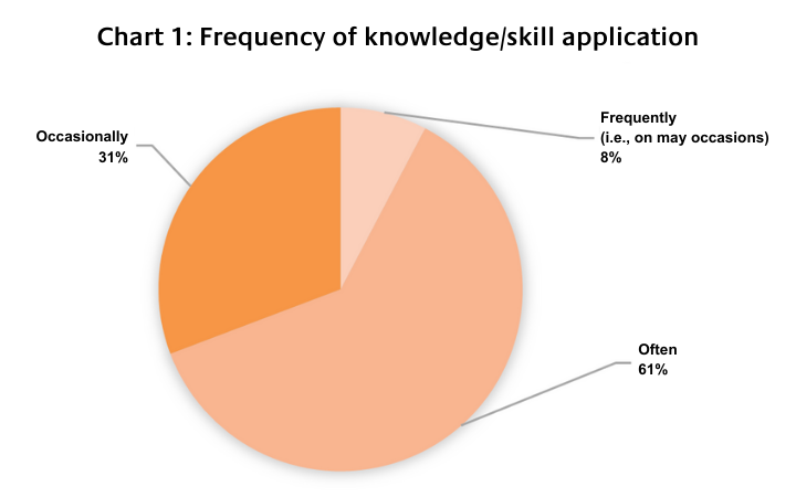 Moreover, one hundred per cent of the respondents have reportedly applied or transferred knowledge from the course to their work with sixty-one per cent reporting that they often apply the knowledge and skills as illustrated in chart 1. In particular, the knowledge from the course related to learning objectives one and three (see below) was applied or transferred by close to eighty-five per cent of the respondents. The chart below indicates the application or transfer of knowledge per learning objective.