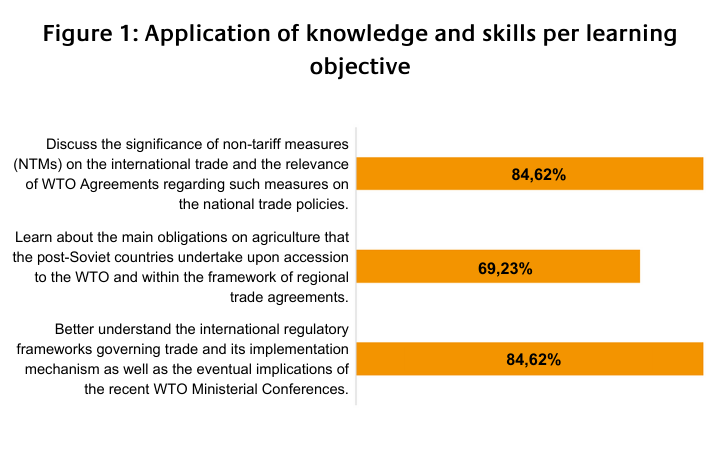 The timeliness of the course was also highly appreciated following member States in the post-Soviet region’s ongoing relations with the WTO and new agreements emerging in relation to trade and agriculture. Demand for the course is also showcased following the high number of applicants for this course. Suggestions from participants included the need for delivery of a follow-up course which focuses further on non-tariff measures as participants found that more knowledge on this aspect is required.