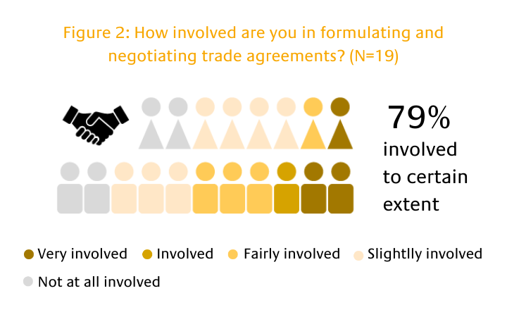 For this story, UNITAR conducted a survey of the 42 participants that completed the course and conducted interviews with Kelvin Nkai, Jean-Baptiste Ukwizagira and Meck Chikaphupha, three participants of the course (1). The survey results show that all respondents are currently involved in developing and implementing evidence-based trade policies to varying degrees, over a year after the end of the course (figure 1), and 78.5 per cent are involved in formulating and negotiating trade agreements to some extent (figure 2). The survey also showed that almost all participants, when asked about the specific learning objectives of the different modules of the course, are at least somewhat confident of still meeting those objectives, showing that the knowledge and skills have taken hold. This finding is corroborated from various interviews to ascertain a deeper impact of the course.