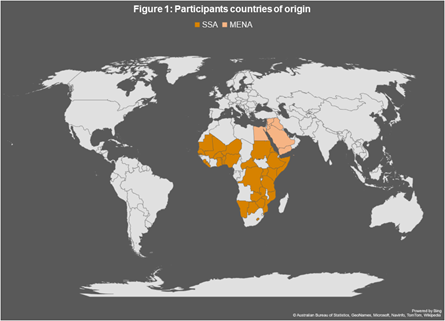 The e-workshops welcomed 195 participants: 103 from the e-workshop on financial inclusion and 92 from the training of trainers (ToT). Participants came from 39 countries from the MENA region and SSA, primarily based in Kenya, Nigeria, Lebanon, Ethiopia and Uganda. Figure 1 shows the participants’ countries of origin. It is worth mentioning that 38 participants enrolled in both e-workshops.