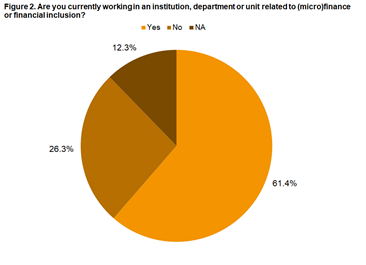 A participants survey was conducted to better understand the potential changes in participants' professional lives derived from the e-workshops. Fifty-seven responses were collected, corresponding to a 36 per cent response rate. Most of the respondents (61 per cent) were working in an institution or area related to financial issues or financial inclusion. Figure 2 shows this distribution. The rate of participants directly working on financial inclusion or financial issues in general, was higher for those who took part in the e-workshop on financial inclusion and sustainable development (64 per cent) compared to participants from the ToT (59 per cent).