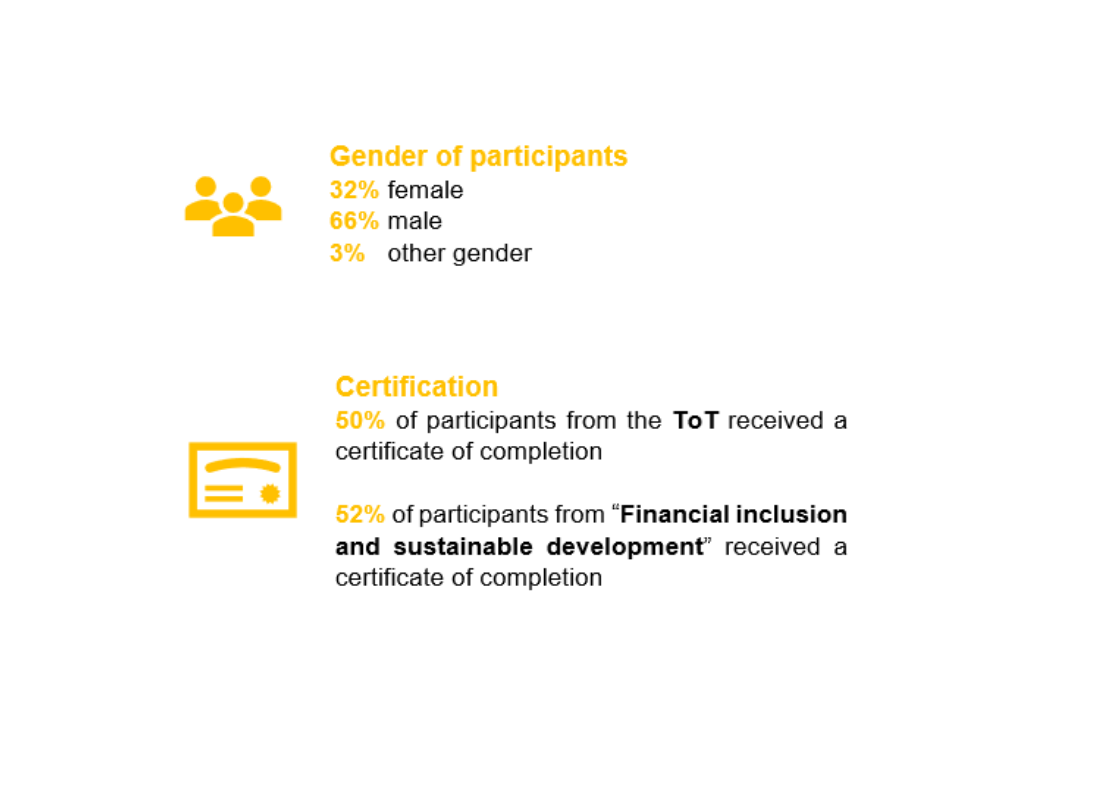 Furthermore, the main work responsibilities of participants from the e-workshop on financial inclusion and sustainable development are directly linked to the topics covered by the training. Seventy per cent of the survey respondents confirmed that their work is related to the areas of financial inclusion, digital finance, sustainable development or economic growth. Similarly, 73 per cent of respondents who participated in the ToT had already experience and some participated in previous training on learning methodologies techniques, communication and leadership skills or other skills relevant for delivering training.