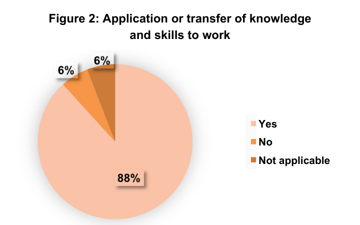 Sixty-five per cent of knowledge and skills applied by the participants was also directly attributed to the training with seventy-three per cent of respondents indicating that they often apply the knowledge and skills in their work. Furthermore, sixty per cent of the respondents noted that the application of knowledge and skills from the course is very important for the success of their work. Following this, fifty-six per cent of the respondents indicated that they were very confident in applying or transferring the knowledge and skills to their work.