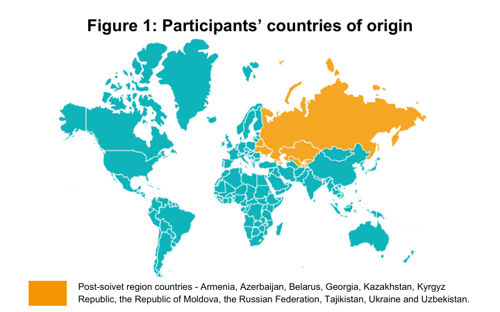The course received 271 applications with 70 participants selected. The participants represented different professional backgrounds, with the majority, 42 per cent, coming from the public sector. The course indicated high participation from women. Sixty-four per cent of the selected participants were women. Russia and Ukraine had the highest number of participants.
