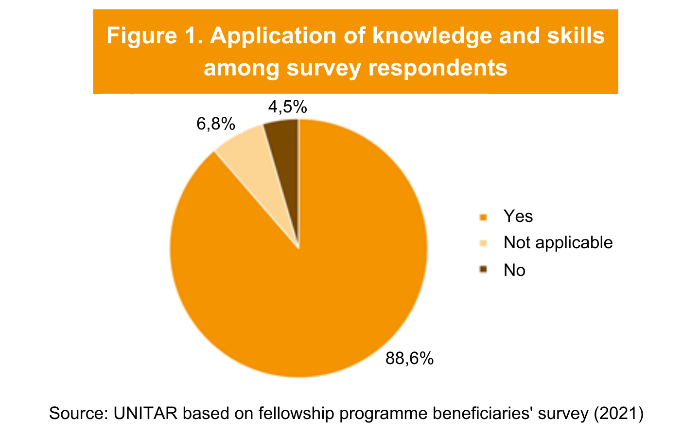An unexpected result from the fellowship programme is the creation of a community by some of the fellows, where they do not only exchange their experiences and ideas, but it acts as a platform to generate job opportunities among them. Perhaps, better follow-up about this practice should be done and shared with new fellows as an opportunity to increase the likelihood of application of knowledge and skills from the course. UNITAR could consider formalizing and further supporting ongoing communities of practice.