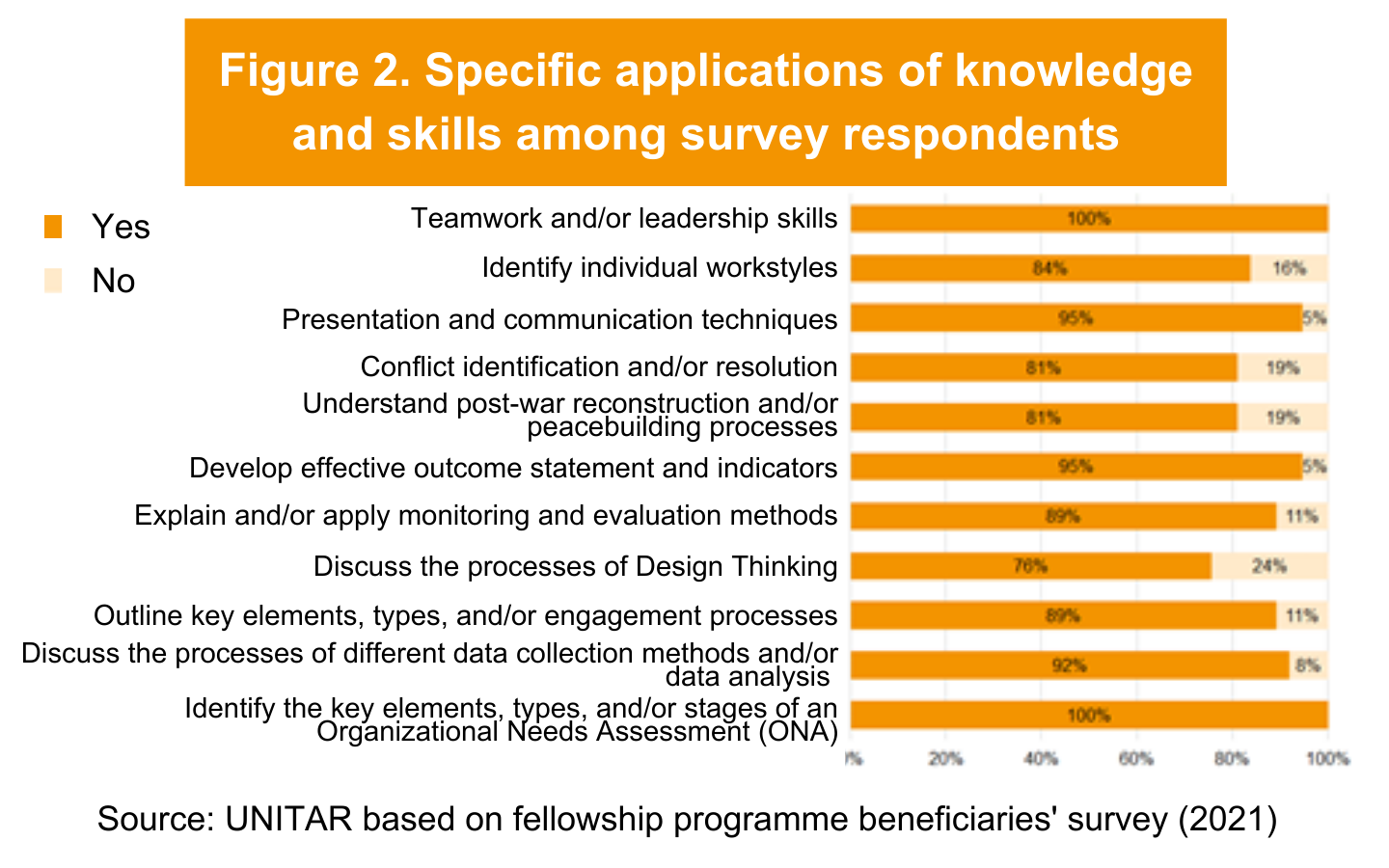 The engagement in areas directly linked to the topics of the programme is reflected in the high number of participants confirming application of knowledge and skills, with an application rate of 89 per cent. The programme participants have applied a combination of both soft and hard skills to their work (see figure 2). Specifically, survey respondents confirmed applying teamwork and leadership skills and application of ONA, specifically. Examples of application of these skills from the participants include: identifying needs during partner selection processes, emergency response needs assessment for flood in Internally Displaced People (IDP) camps and conflict-affected areas, incorporation of steps on how to conduct needs assessments in academic lectures, incorporation of teamwork and problem-solving strategies, leading capacity building on leadership and management skills at work, implementation of environmental needs assessments, among others.
