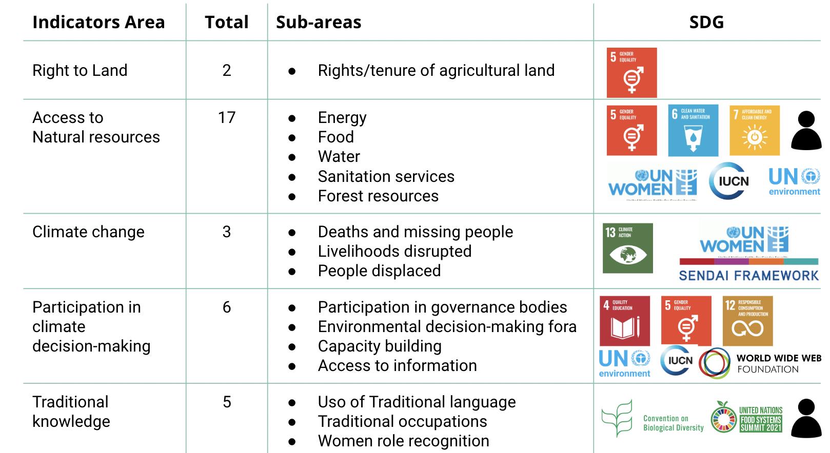 These data capture 33 indicators with gender dimensions in five areas, as illustrated below: