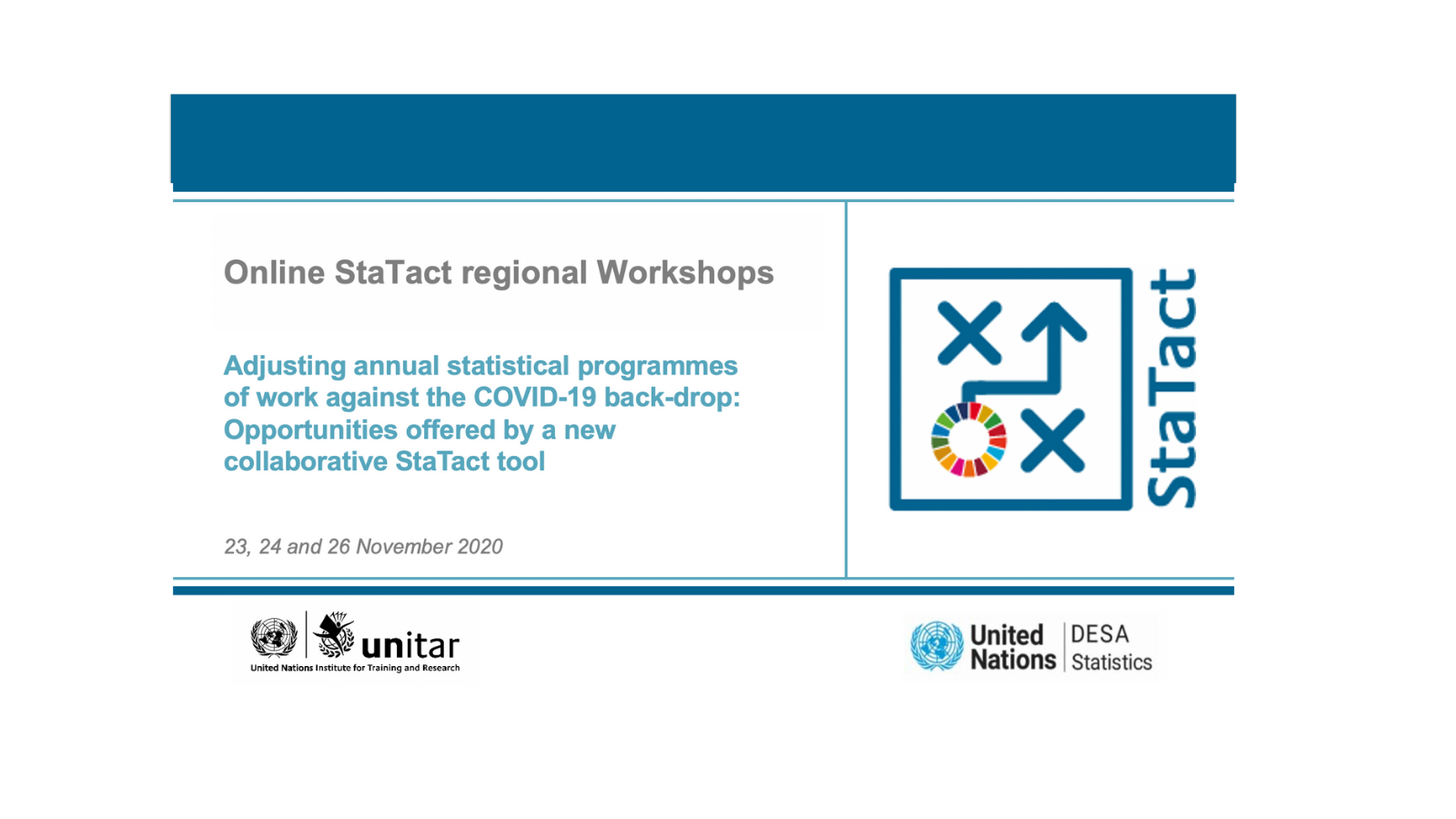 In November 2020, UNITAR hosted – in collaboration with the UN Statistics Division - three regional online workshops for the Latin American, African and Asian regions to demonstrate the use of the updated, collaborative StaTact platform to respond to new challenges that have arisen as a result of the COVID-19 crisis and to make necessary adjustments to the annual statistical programmes of work. This was followed by the presentation of StaTact during the Webinar of the Global Network of Data Officers and Statisticians by UNITAR and UNSD on 8 December 2020.
