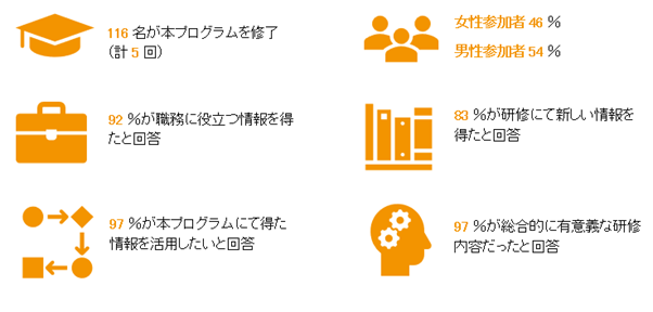 今回のアンケート調査や体験談から、本プログラムの実践的な研修内容が、参加者の職務生活に貢献していることが見て取れます。研修後、本プログラムにて学んだハードスキルとソフトスキルの多くが幅広く実務に活用されています。ハードスキルのうち、特に汎用性が高いスキルはONA(組織ニーズアセスメント手法)でした。ソフトスキルについても、研修中に学んだチームワークやリーダーシップスキルを職務に活かしているとの声が多く聞かれました。本プログラムと、研修生の職業や過去の研修参加経験における学びが相乗効果をもたらし、新しい知識やスキルの実践につながっています。また、本プログラムの構成や、コーチやメンターのサポート体制も成功要因の一つです。優秀な研修生をコーチとして再度研修に迎え入れることにより、研修生、コーチともに更なるスキルアップにつながり、人的ネットーワーク拡大の機会にもなっています。