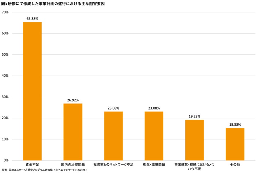 研修における学びを上手く活用することが出来た背景として、84%が研修を受講したことでついた自信、79%が知識の拡充、74%が研修の適切な構成と手法、69%が研修内容の職務における実用性を挙げています。これらの点から、個人のスキル、職場の環境、また適切な研修内容と構成それぞれが、修了生が研修内容をいかに活用できるかに関わっていることが窺えます。一方で、事業計画の遂行については、66%が資金不足が足かせになっていると回答しています。研修中に作成した事業計画について、実行した割合は37%(15名に相当)と低くないものの、多くの修了生が遂行段階で課題に直面しています。図3のとおり、資金不足、国内の治安問題、投資家とのネットワーク不足、新型コロナウイルス流行を含む衛生・環境面の課題が主な阻害要因として挙げられました。