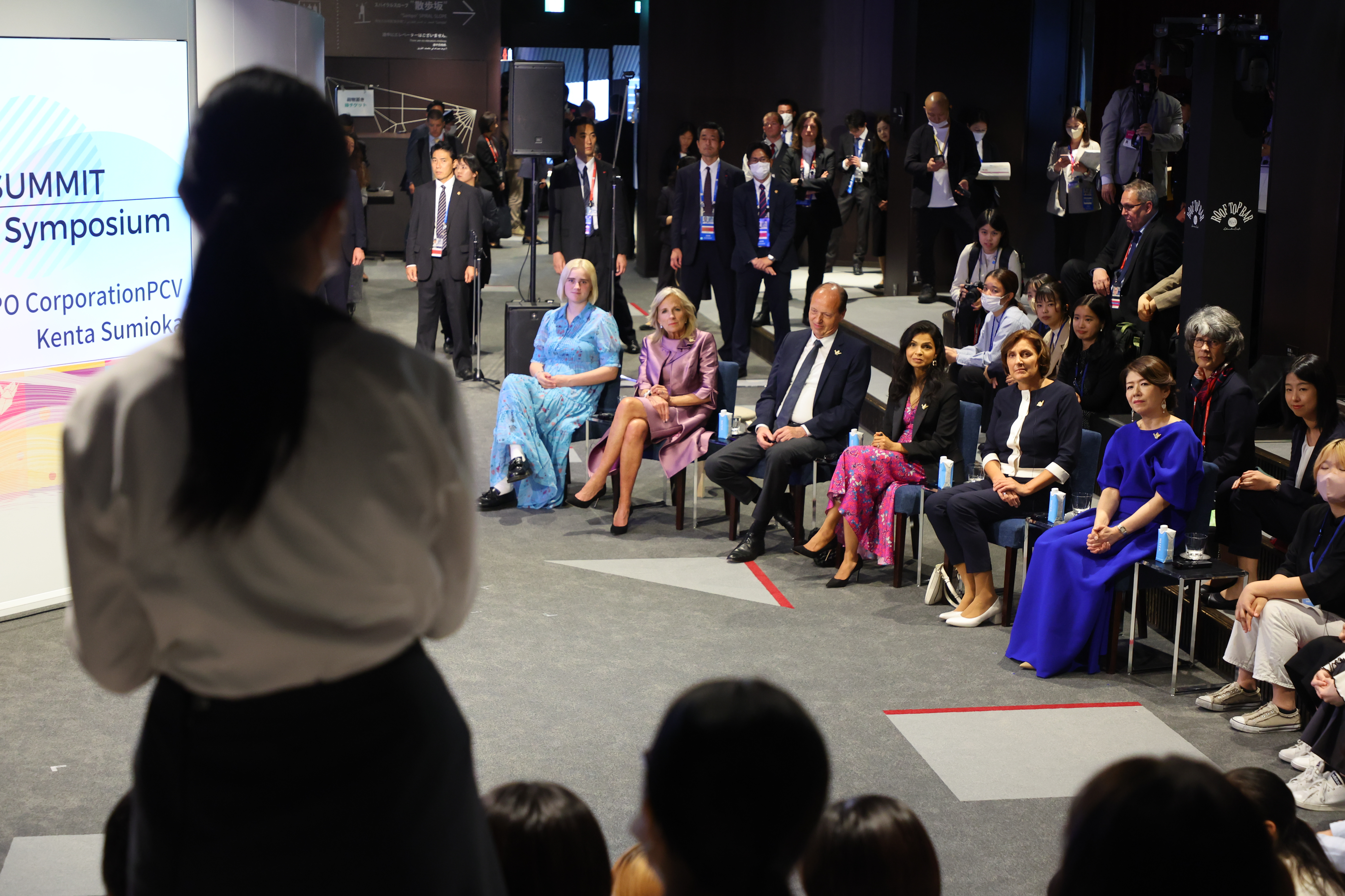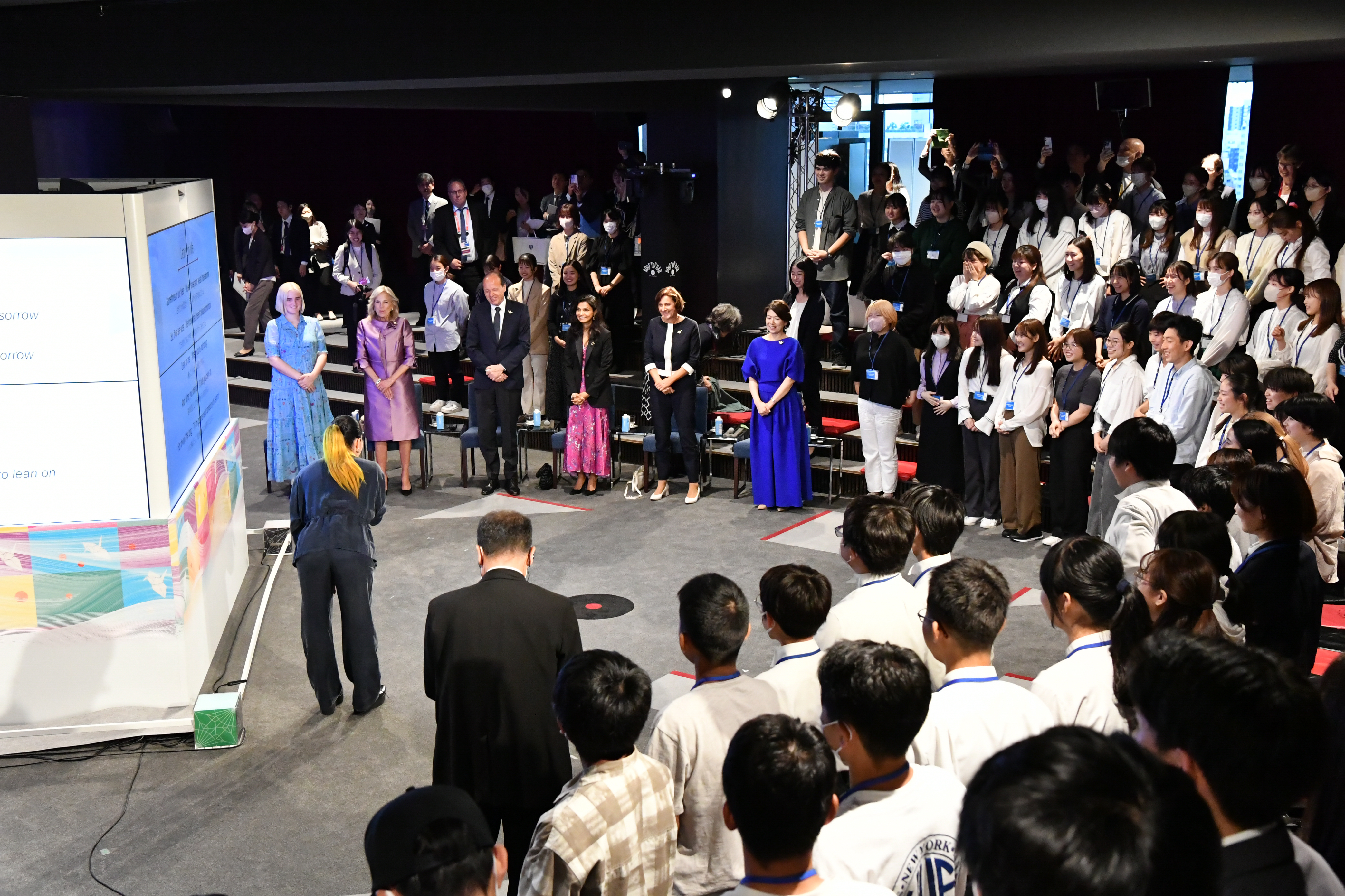 シンポジウムに参加された岸田裕子夫人は、G7首脳やイベントに参加している学生も、皆等しく、平和な世界を願うプレーヤーだとした上で、「今日、この場にいる皆さんにはこのシンポジウムでご自身と平和との関わりについて、新しい気づき、そして新しい関わり方を見つけて、平和に向けた歩みを更に進めていただきたい。この広島の若い世代から世界中に平和の祈りの和が広がっていくことを願う。」と述べました。