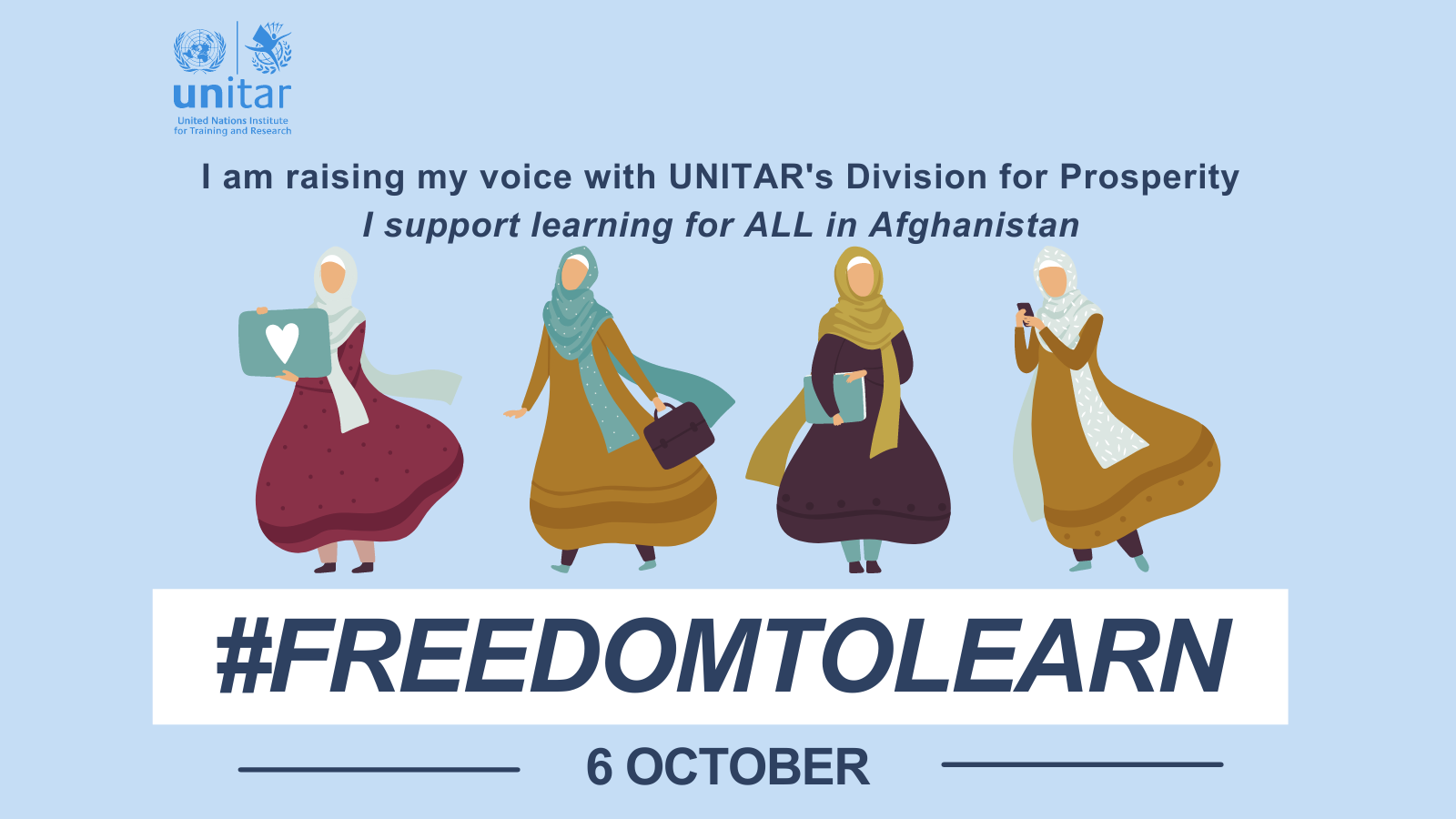 また、すべてのアフガニスタンの人々の学ぶ機会を守り、尊重するため、ハッシュタグ#FreedomToLearn #学ぶ自由を をつけて応援メッセージをともに発信するソーシャルメディアキャンペーンもはじめています。誰もが学べる社会にしていくためにできることや、アフガニスタンの人々を応援する気持ちなどを、あなたもぜひFacebookやTwitter、Instagramなどで表現してみませんか。お問い合わせはprosperity_communications@unitar.orgまでお願いします。