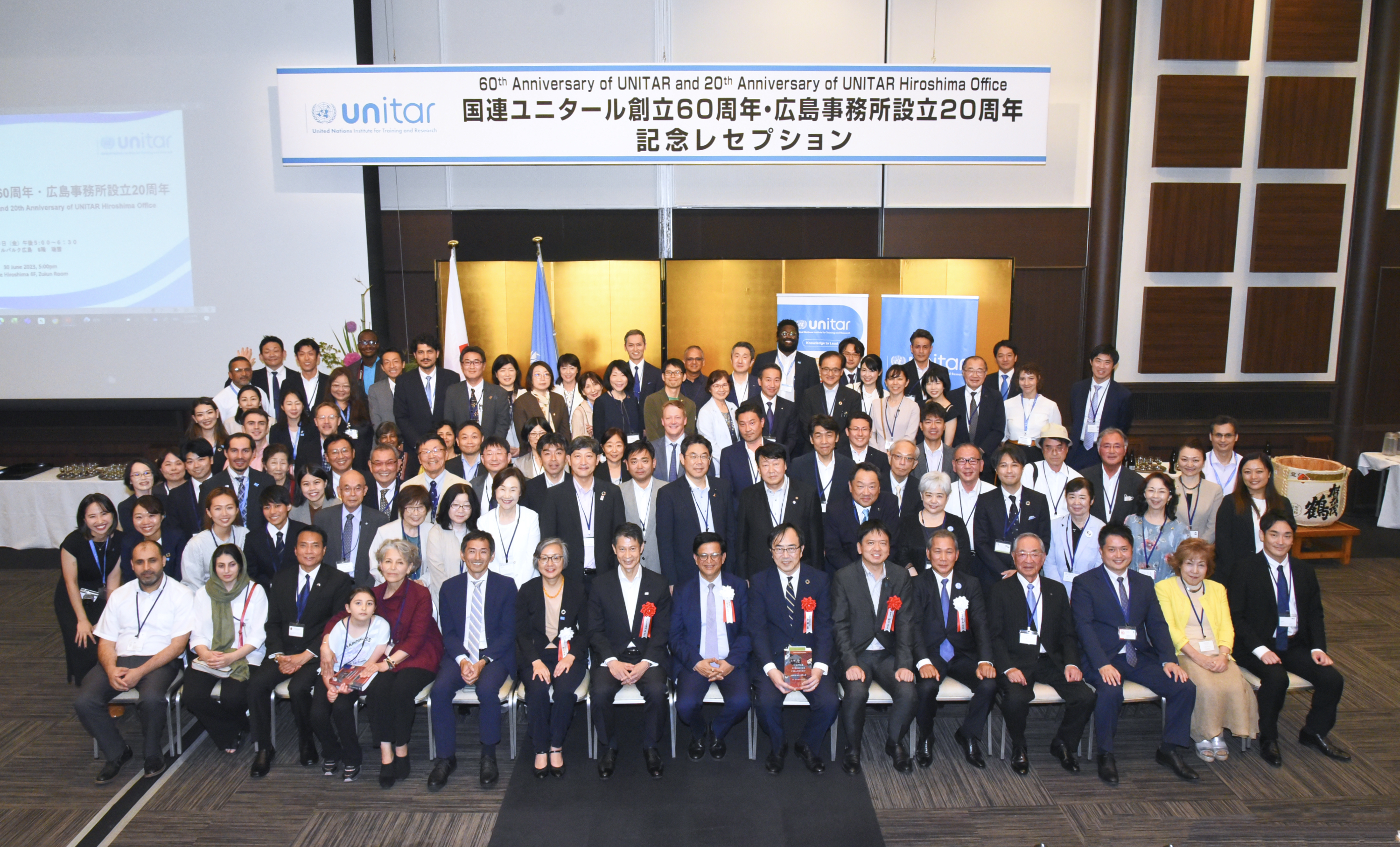 2023年7月24日・広島‐国連訓練調査研究所(ユニタール)は、本部設立60周年およびユニタール広島事務所設立20周年を記念し、東京と広島で記念式典を開催しました。東京の式典は、6月29日に国連大学で、広島の式典は、6月30日にホテルメルパルク広島で開催しました。