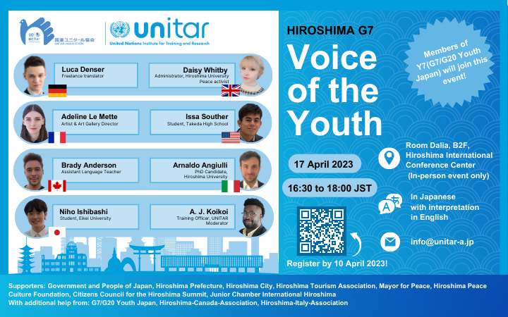 2023年3月28日・広島 - 広島に各国首脳が集うG7サミット開催の好機をとらえ、国連訓練調査研究所(ユニタール)持続可能な繁栄局・広島事務所は、国連ユニタール協会との共催により、G7参加国出身で現在広島に在住している若者計7名を招き、外から見ていた「広島」と実際に住んでみて感じた「広島」について、また、広島から世界に発信される平和のメッセージの意義について語り合うパネルディスカッションを開催します。