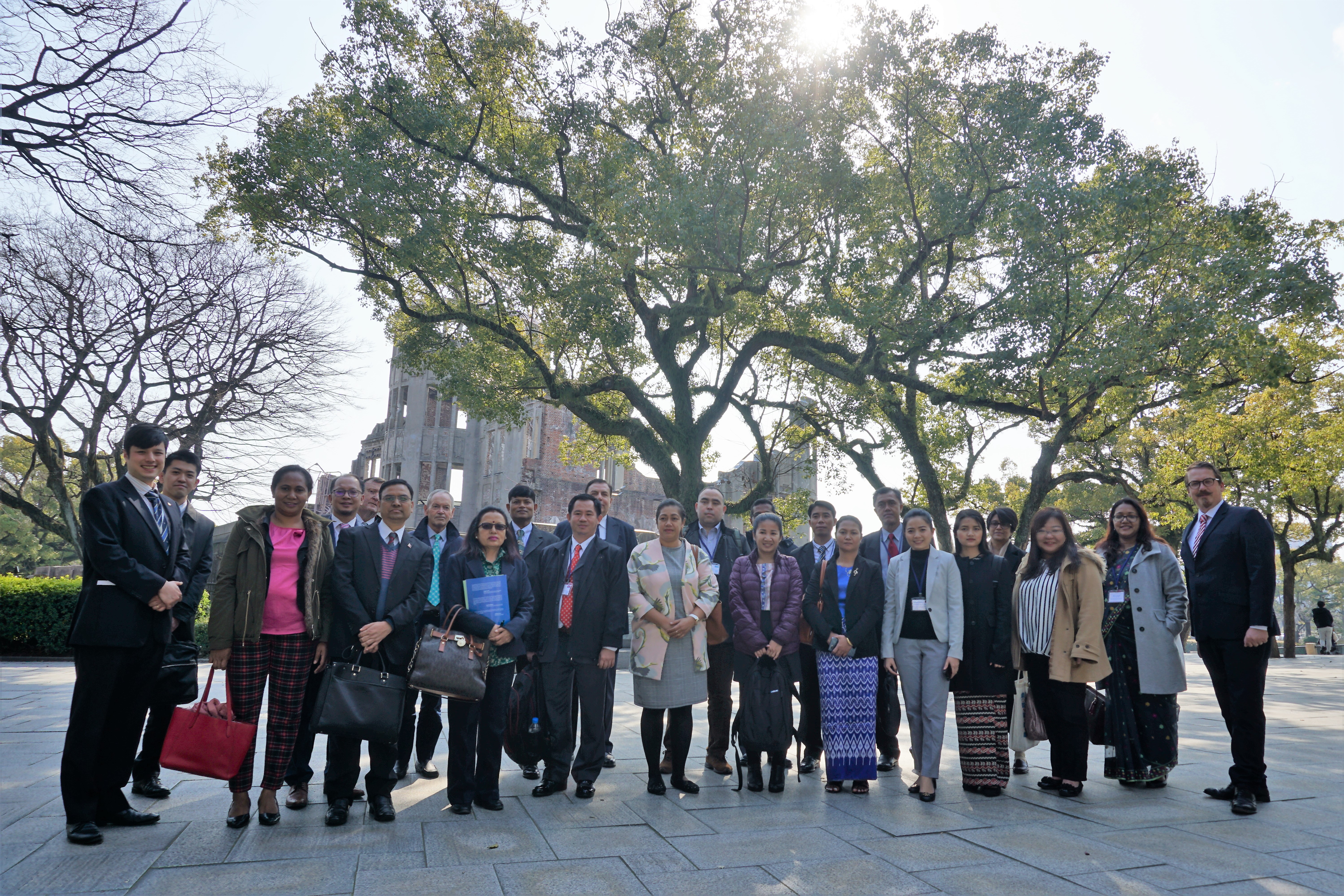 2018年度の研修ではカザフスタン、カンボジア、スリランカ、ネパール、バングラデシュ、東チモール、マレーシア、ミャンマー、モンゴルとラオスの防衛省と外務省代表の19名の研修生を迎えました(女性10名)。参加国10か国のうち8か国が核兵器禁止条約(TPNW)に署名しており、5か国が非核兵器地帯です。