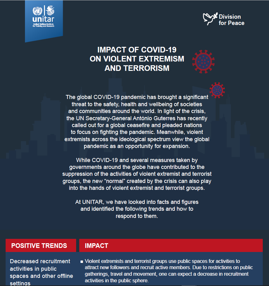 The global COVID-19 pandemic has brought a significant threat to the safety, health and wellbeing of societies and communities around the world. In light of the crisis, the UN Secretary-General António Guterres has recently called out for a global ceasefire and pleaded nations to focus on fighting the pandemic. Meanwhile, violent extremists across the ideological spectrum view the global pandemic as an opportunity for expansion. While COVID-19 and several measures taken by governments around the globe have contributed to the suppression of the activities of violent extremist and terrorist groups, the new “normal” created by the crisis can also play into the hands of violent extremist and terrorist groups. At UNITAR, we have looked into facts and figures and identified some important trends and possible responses, which can be found in the publication below.