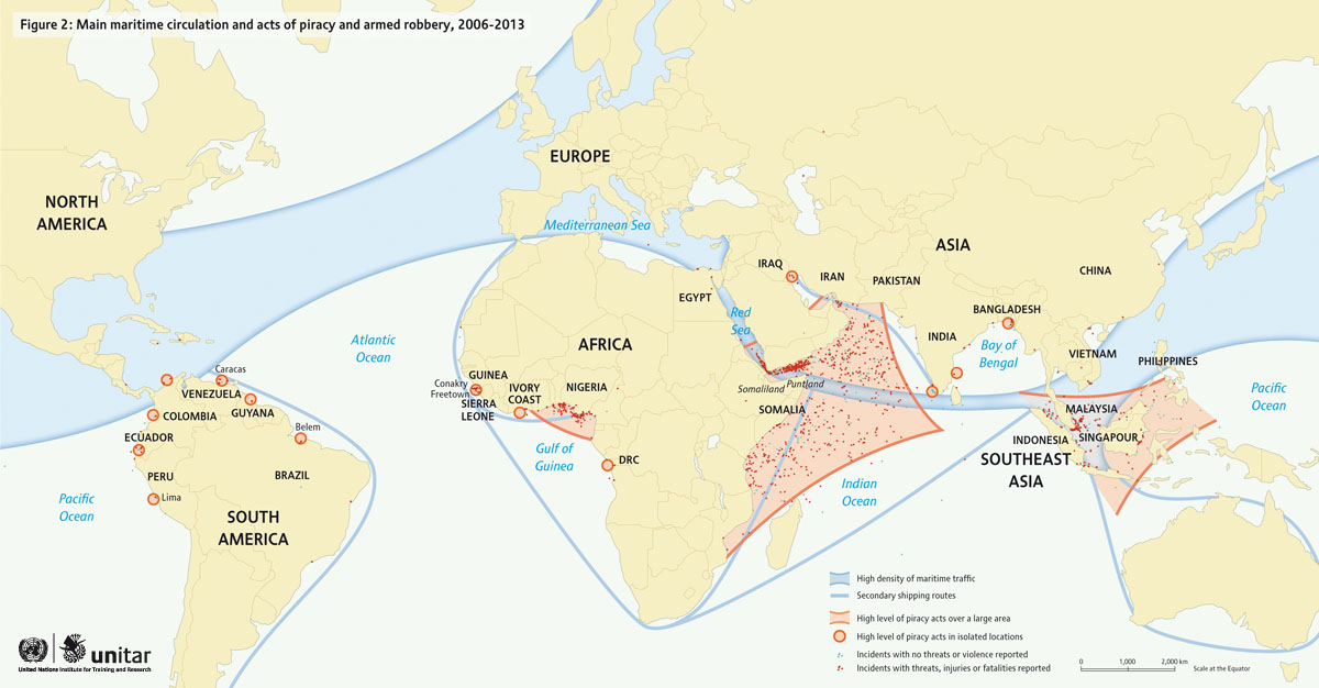 Following a five year engagement by the United Nations Institute for Training and Research (UNITAR) to conduct applied research and geospatial analysis on piracy activities, this report constitutes the first global geospatial analysis on the issue. What started with identifying captured ships delivering humanitarian assistance and other goods using satellite imagery later expanded to regional geospatial analyses for the western Indian Ocean. The current report assesses piracy at the global level. This research includes detailed geo-spatial analyses, while relating findings to complementary factors, including references to specific examples illustrating the complexity of the piracy issue. The report also covers the financial aspects of global piracy, as well as anti-piracy activities and future outlooks in a changing meteorological climate.
