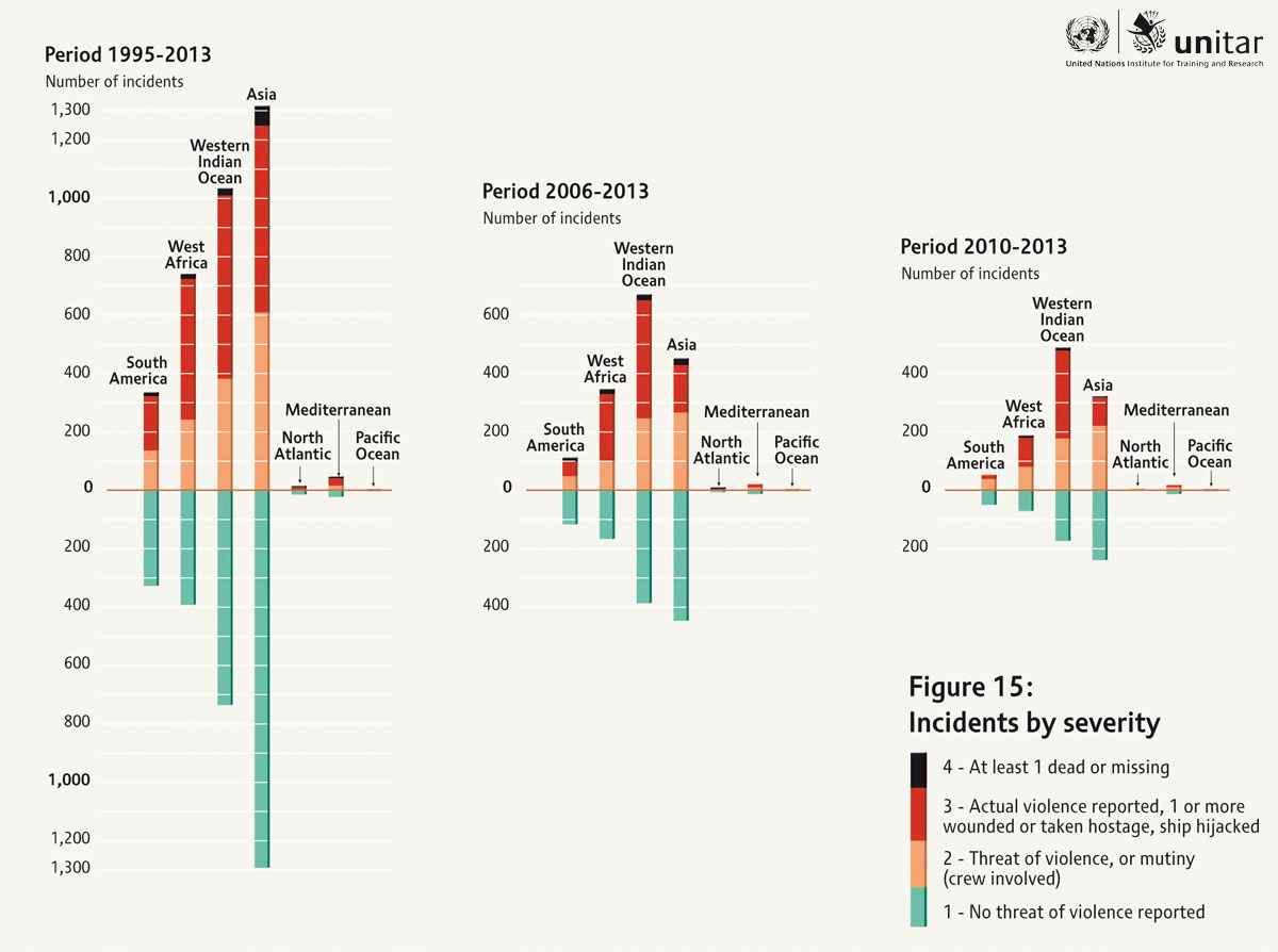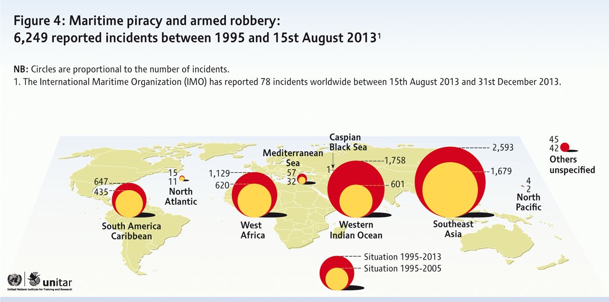This global report on maritime piracy has identified several important trends related to maritime security. Based on a refined and detailed analysis of primarily data from International Maritime Organization (IMO) Global Integrated Shipping Information System (GISIS) «Piracy and Armed Robbery» module - International Maritime Organization (IMO) Global Integrated Shipping Information System (GISIS) - UNITAR has been able to explore how trends in geospatial patterns and severity of reported piracy incidents are developing, from 1995 to 2013.