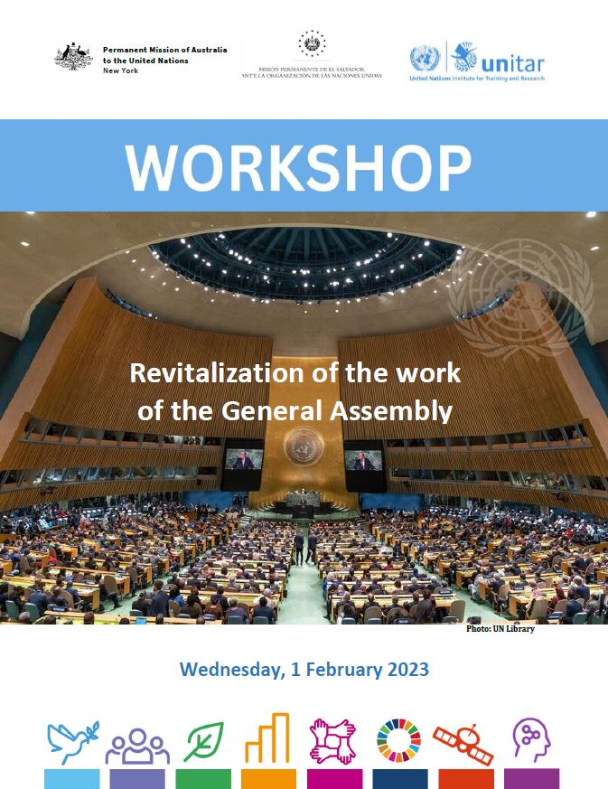 1 February 2023, New York, USA.- United Nations delegates and experts participated in a tailored workshop entitled Revitalization of the Work of the General Assembly. Building upon past and ongoing experiences, all segments of the workshop aimed to enhance delegates’ capacity and essential knowledge of the background, mandate, main areas, and outcomes of the Ad Hoc Working Group (AHWG). Organized by the Permanent Missions of Australia and El Salvador and supported by the UNITAR New York office, the workshop counted nine presenters and more than 140 participants in an in-person setting at the United Nations.