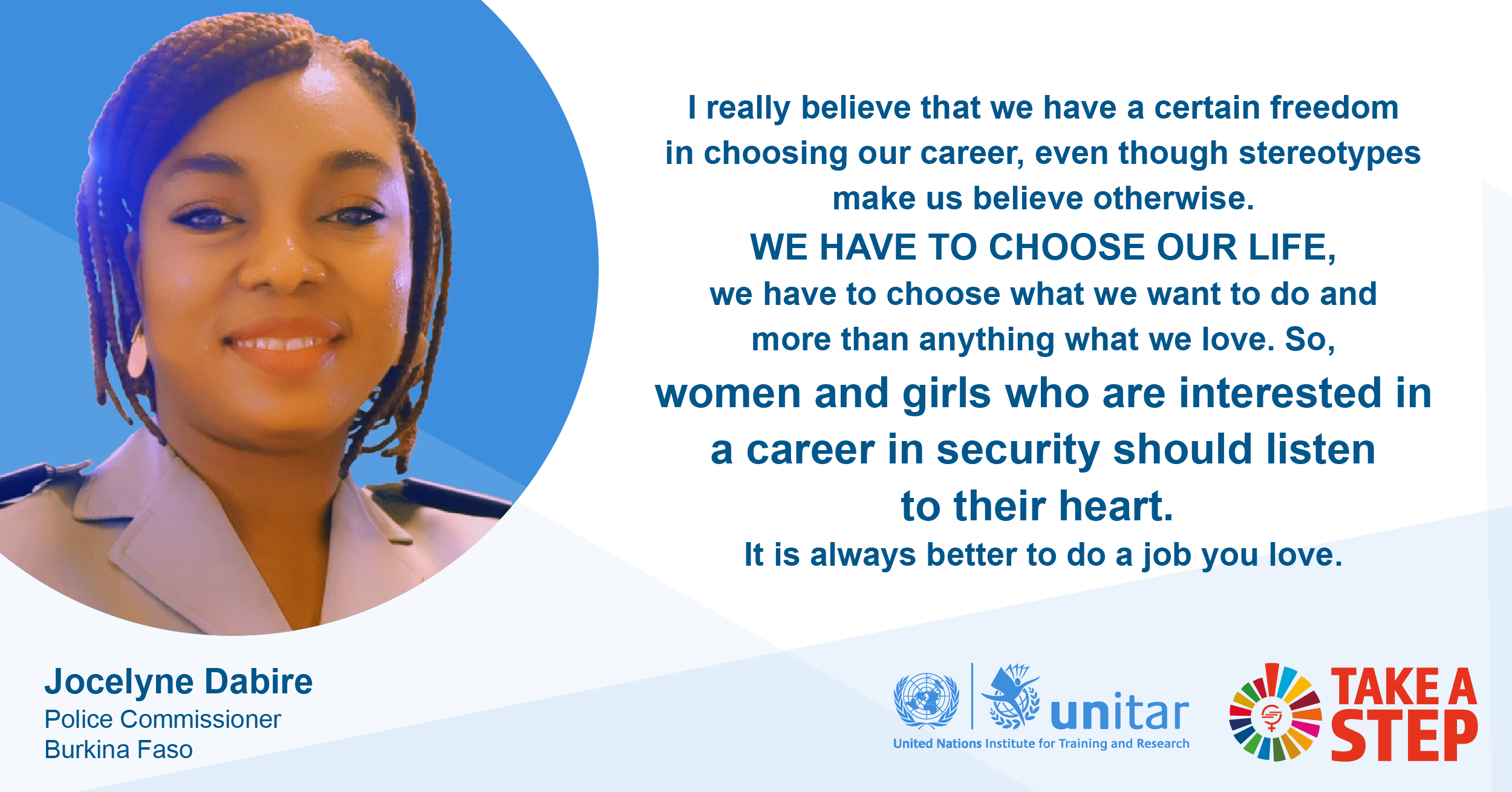 We are delighted to announce the second woman to be profiled in our #TakeAStep interview series. Jocelyne Dabire is a police commissioner from Burkina Faso. Talking stereotypes, motherhood and being brave enough to take that leap of faith - all of this in our next article to be published next week. #TakeAStep and stay tuned to learn more about Jocelyne's inspiring career trajectory in the field of peace and security. The interview is available on UNITAR Medium in English and French.