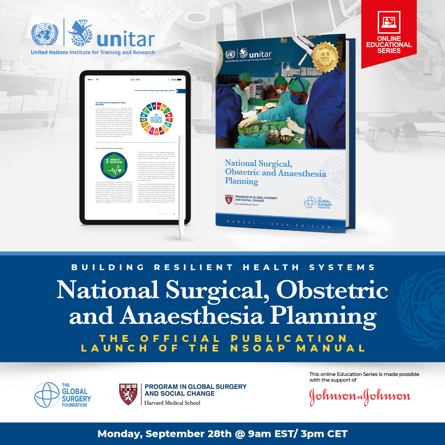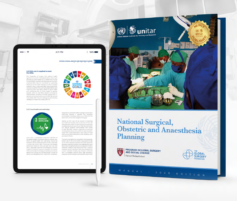 The NSOAP Manual was published as a collaborative initiative between the United Nations Institute for Training and Research (UNITAR), the Harvard Medical School Program in Global Surgery and Social Change, and the Global Surgery Foundation. Its launch at a special Educational Online Event Series on 28 September 2020 was made possible by the generous support of Johnson & Johnson.