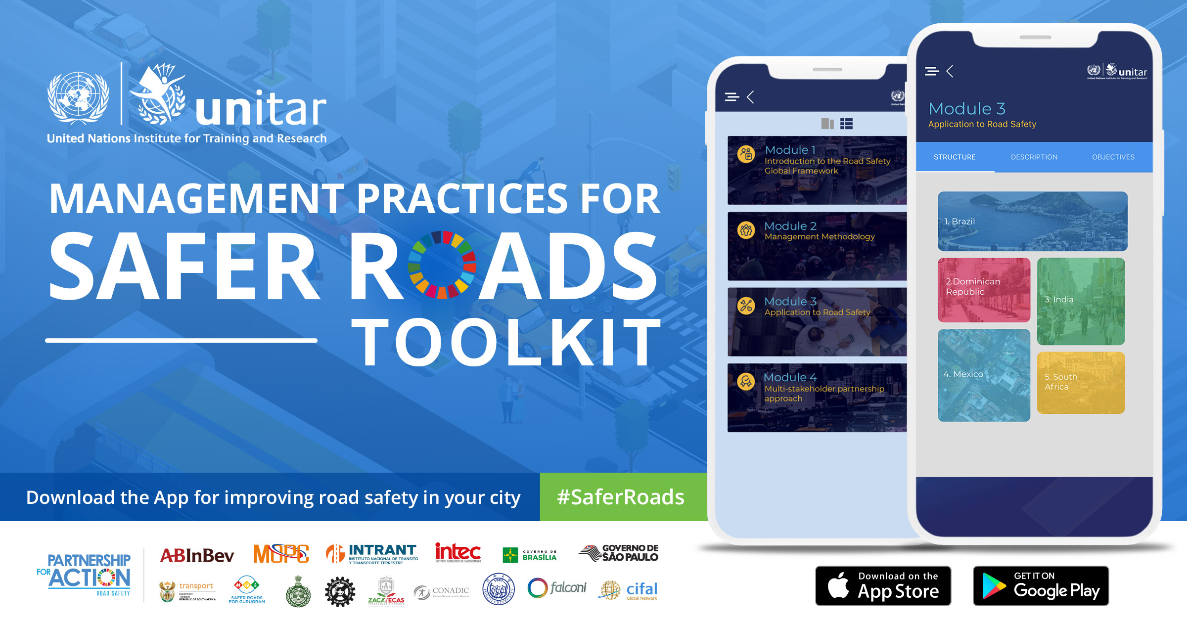 With the aim of contributing to advance road safety, the United Nations Institute for Training And Research (UNITAR) developed the "Management Practices for Safer Roads Toolkit Learning App" which presents a practical management methodology that can be applied in the field of road safety.