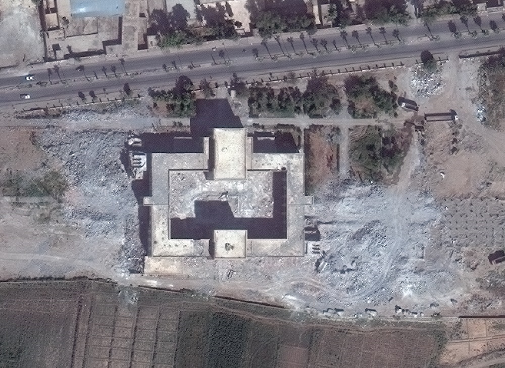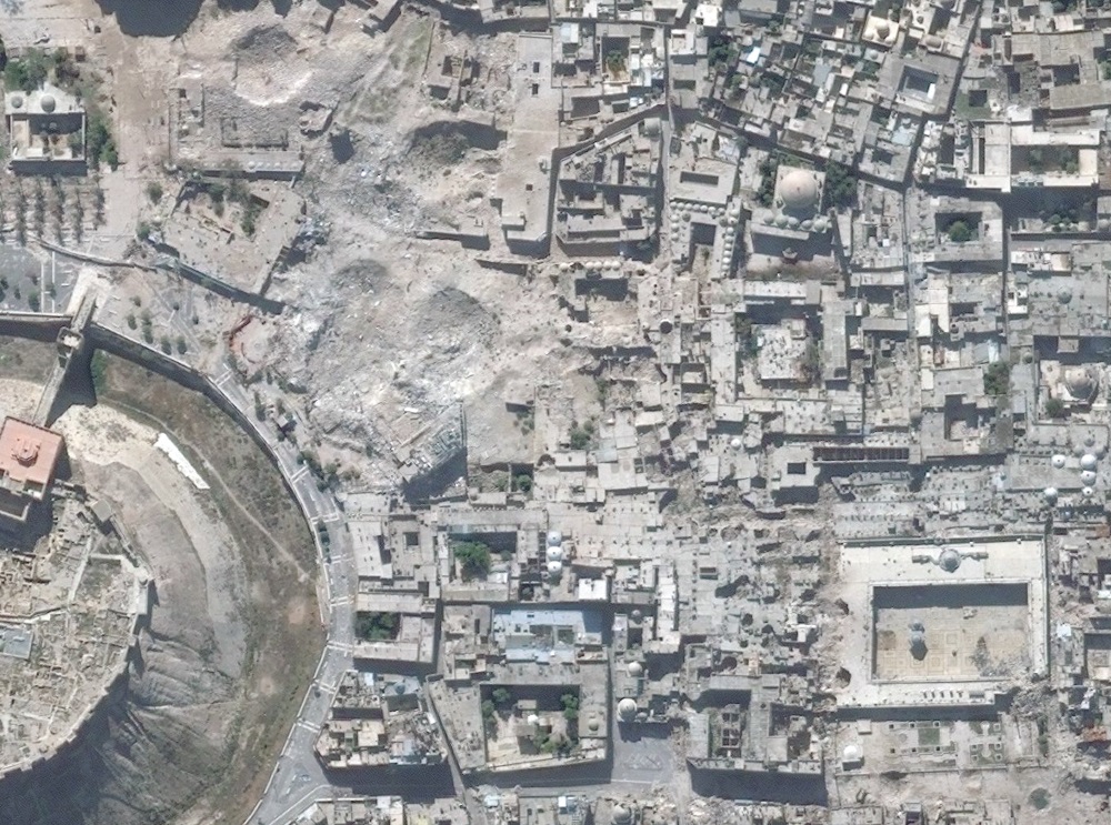 Multiple historical sites destroyed as seen in the upper left section of the image, such as the Carlton hotel, where craters are present. Other damaged locations include the Great Umayd Mosque in the lower right corner of the image. Minaret of the Great Mosque has been destroyed, in addition to severe damages to the wall and courtyard.