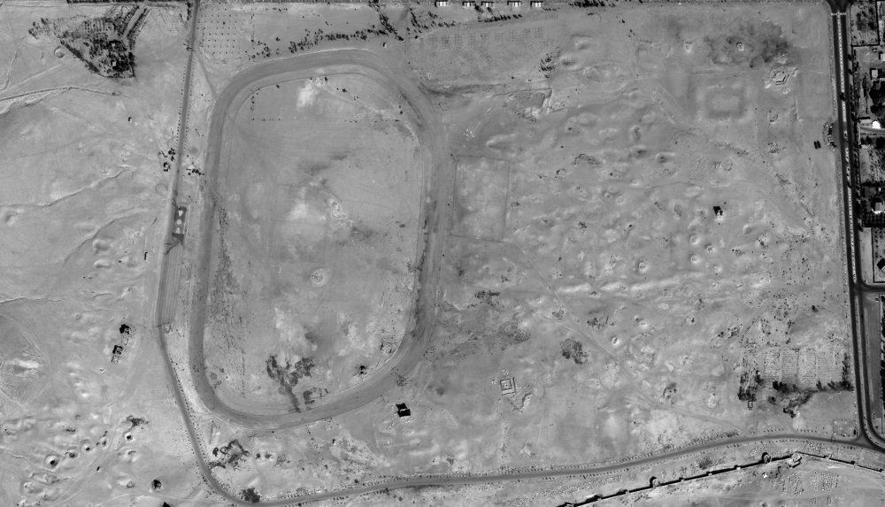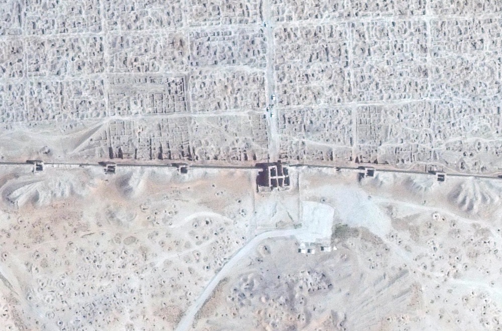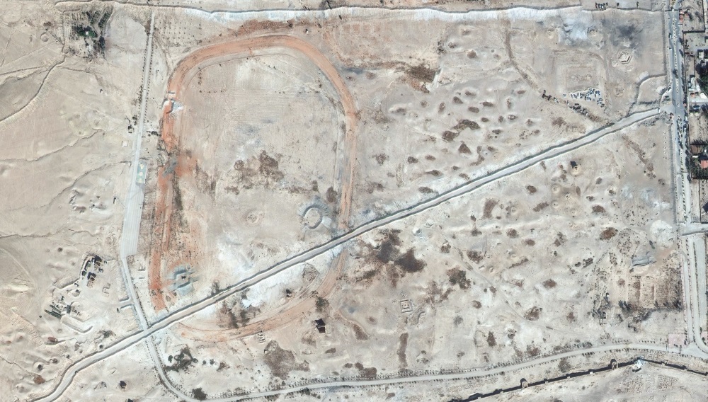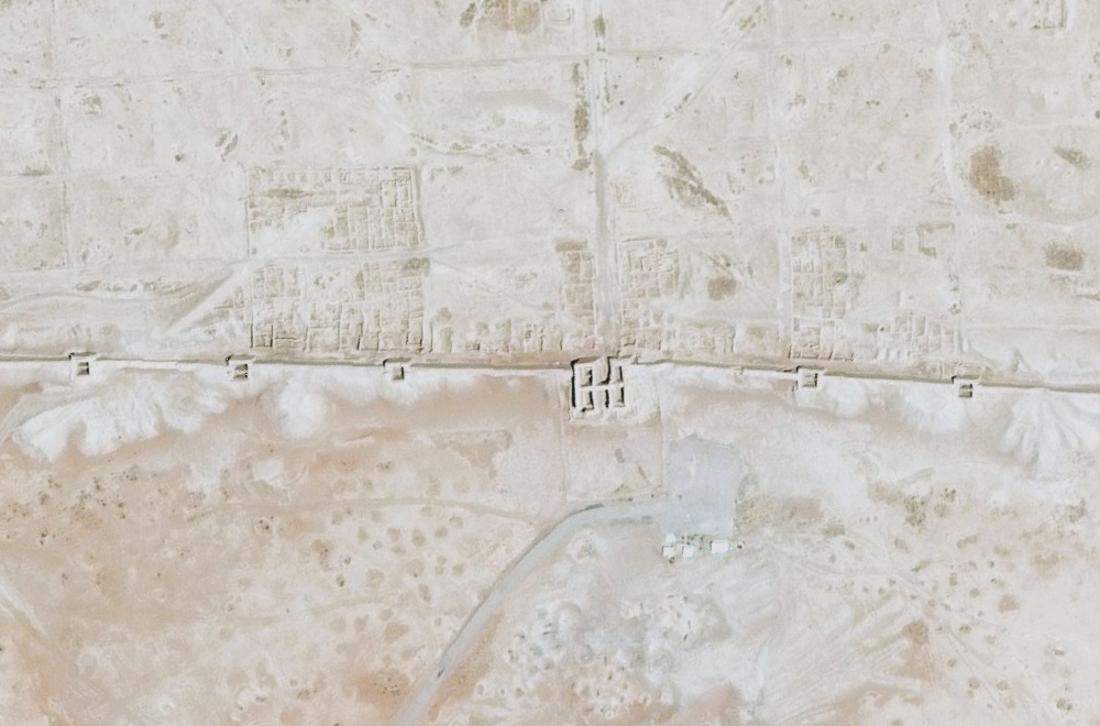 Signs of severe looting can be seen within the walls of Dura Europos, most of the ruins have become unrecognizable from the looting activity. Addtional looting holes are visible in the northern section of the image outside the walls of Dura Europs.
